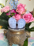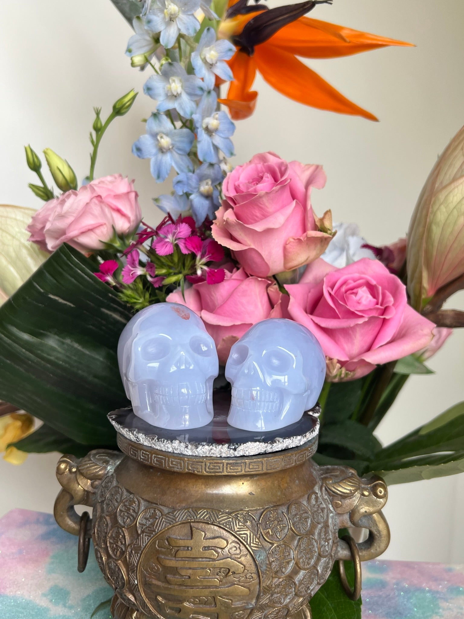 De Blauwe Chalcedone Skull bevordert communicatie en emotionele balans, en helpt bij het uiten van je waarheid. Om met deze skull te connecten, plaats je hem op je keelchakra en laat je zijn energie je communicatie versterken.