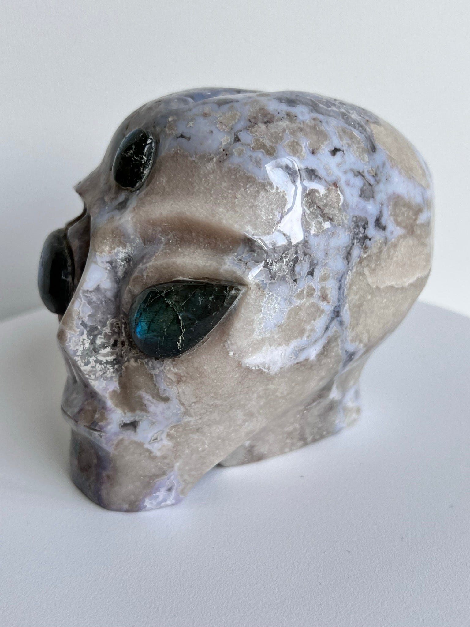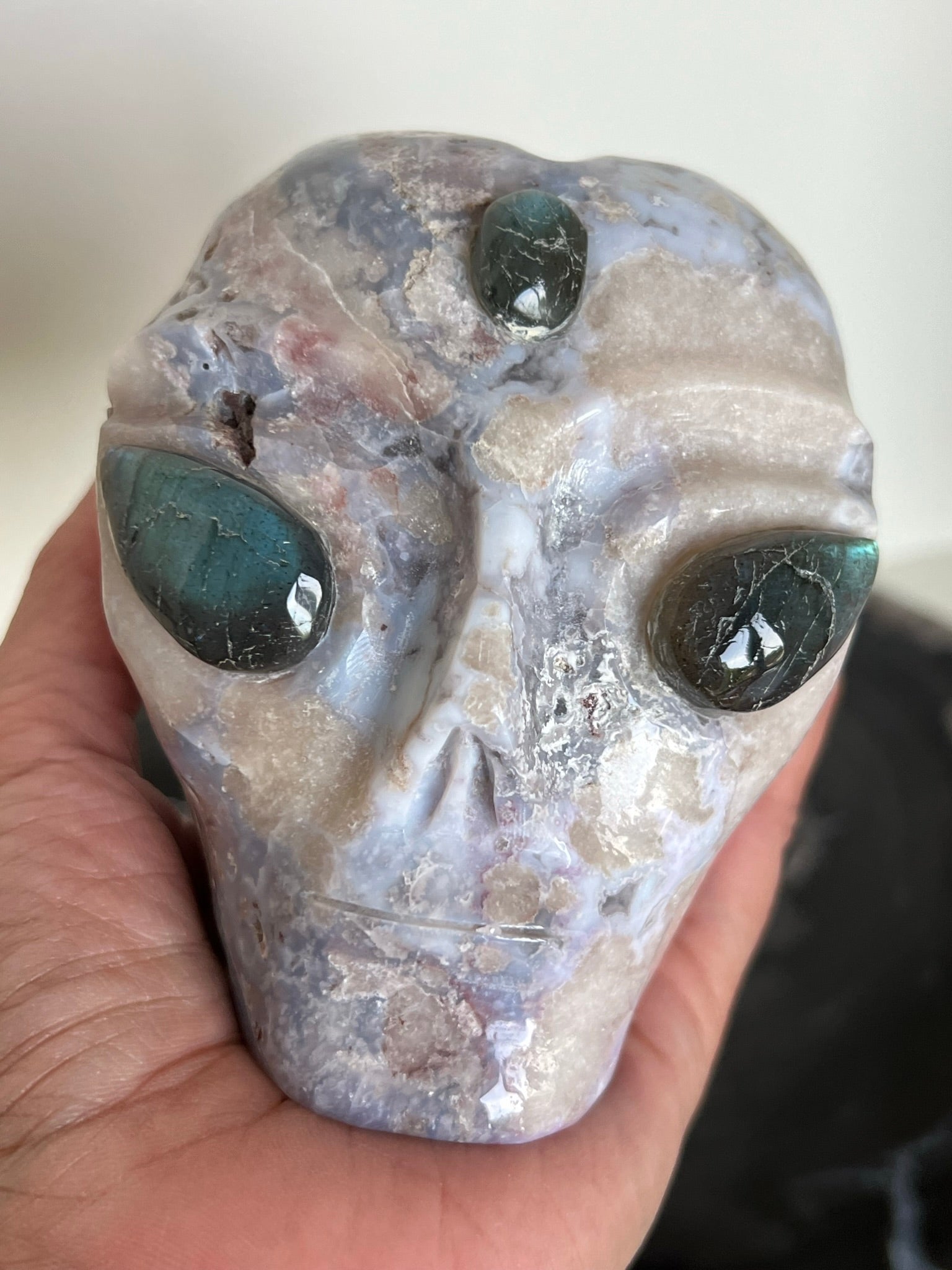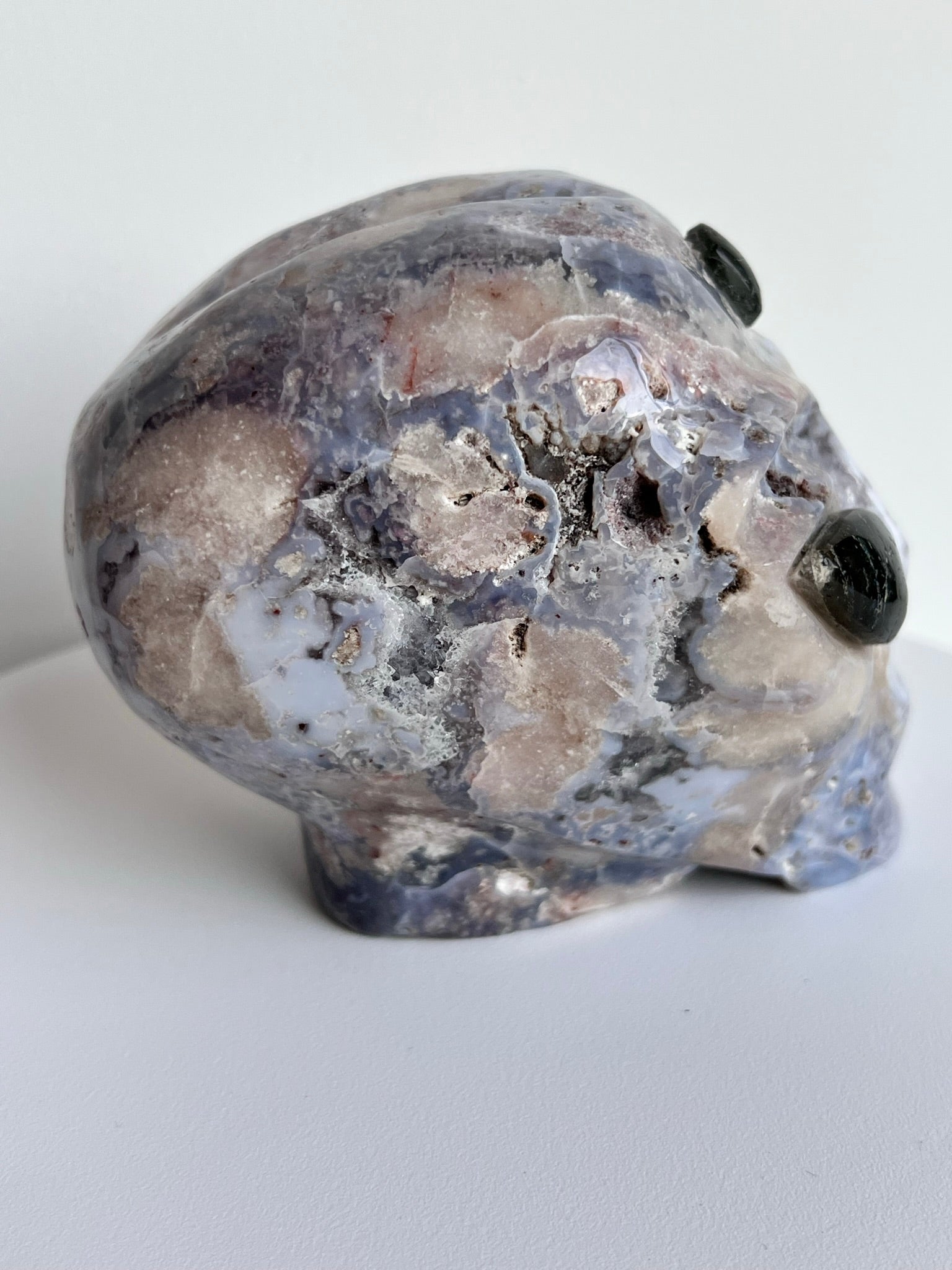Bloemagaat Skull: De Bloemagaat Skull werkt op het basischakra en brengt aarding en stabiliteit. Om met deze skull te connecten, plaats je hem op de grond en laat je zijn aardende energie door je voeten stromen.