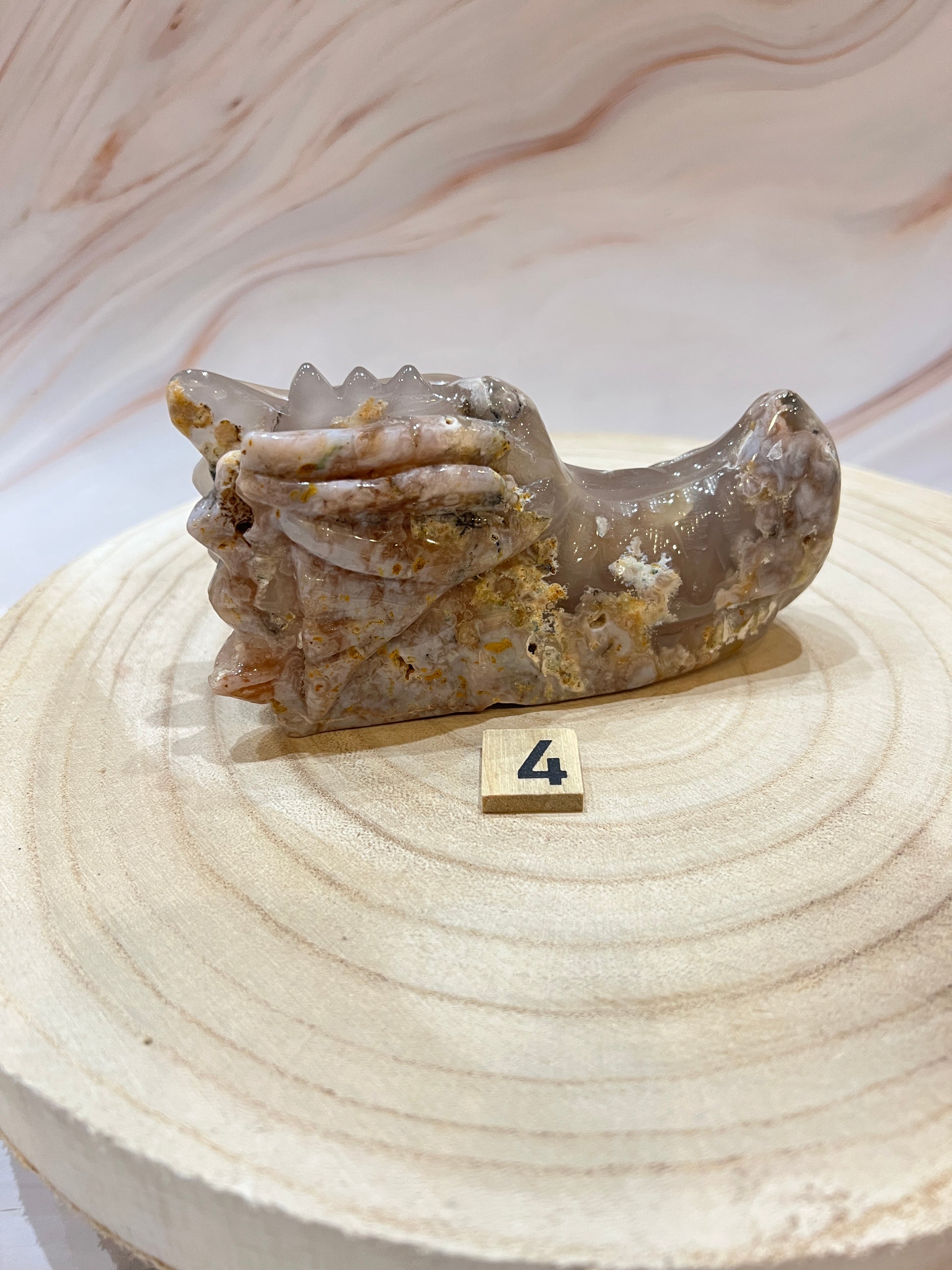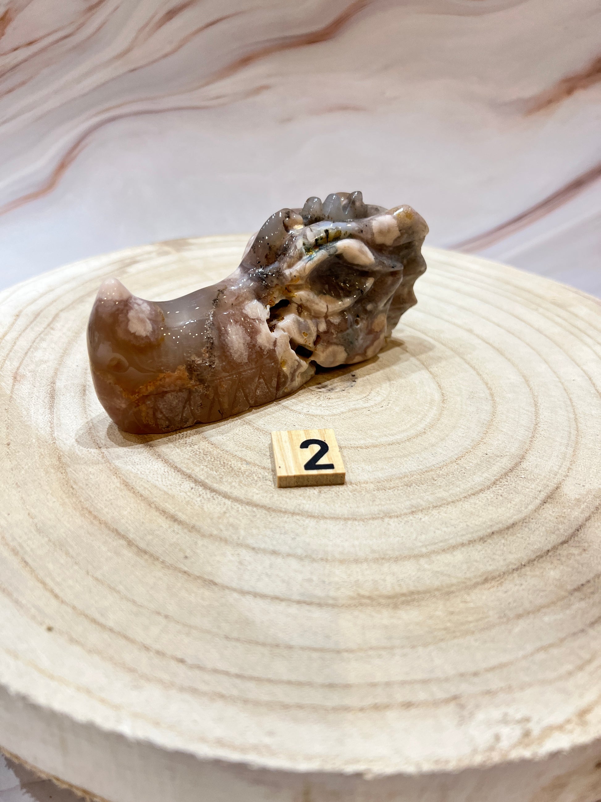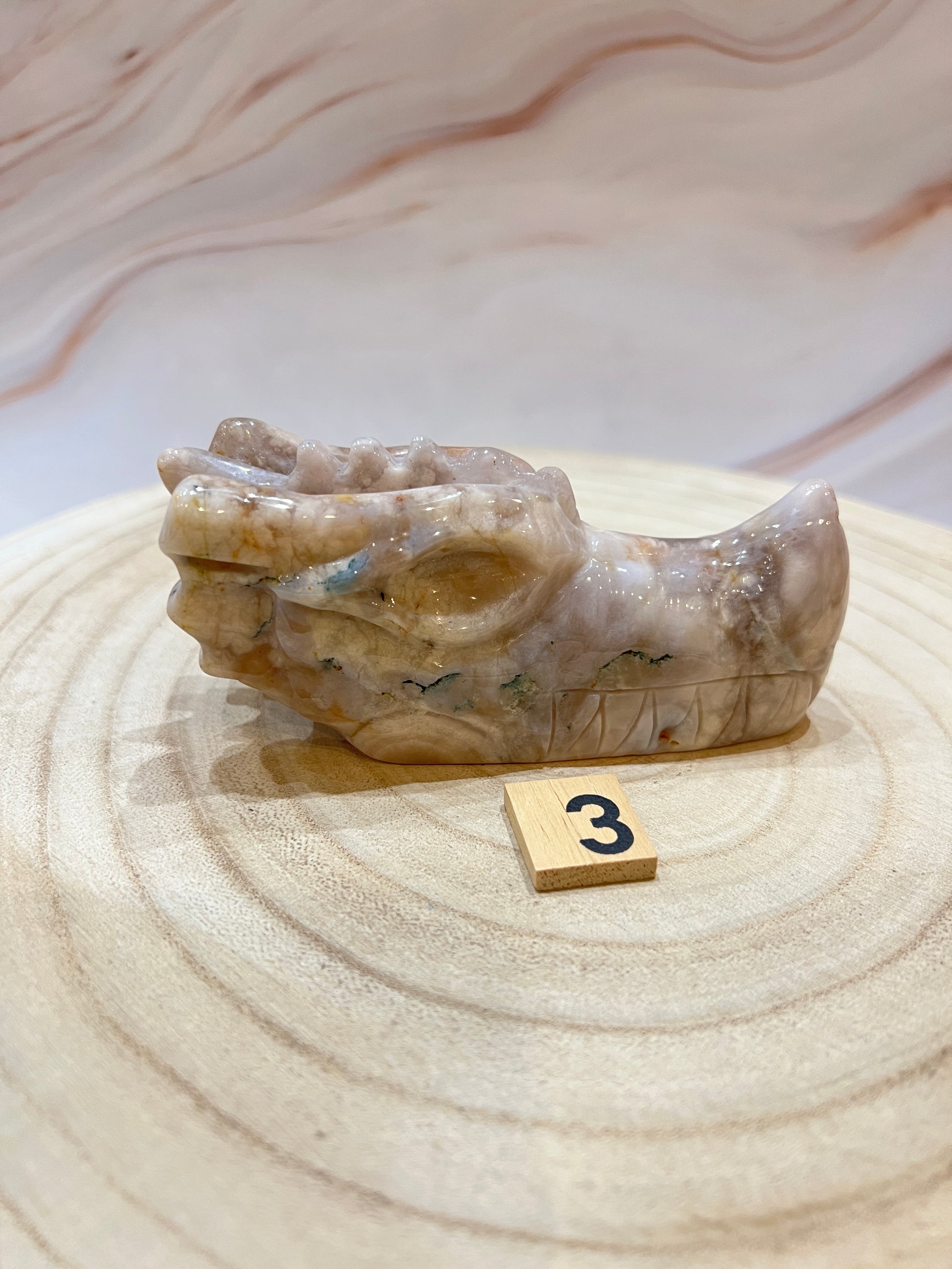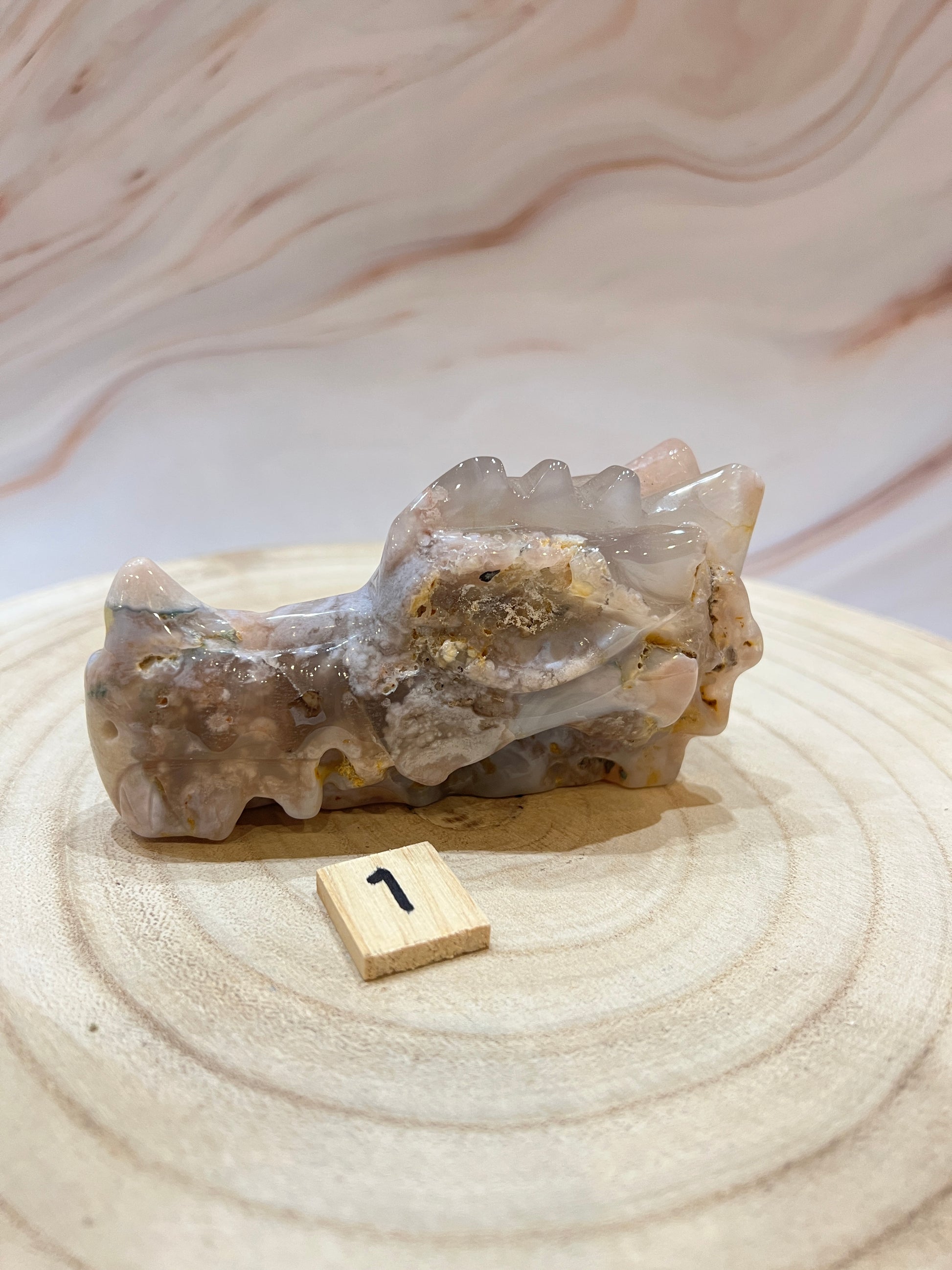 ✨ Eigenschappen: Unieke handgesneden drakenkoppen van bloemagaat, een steen van groei, moed en zelfontwikkeling.