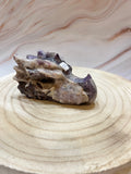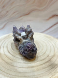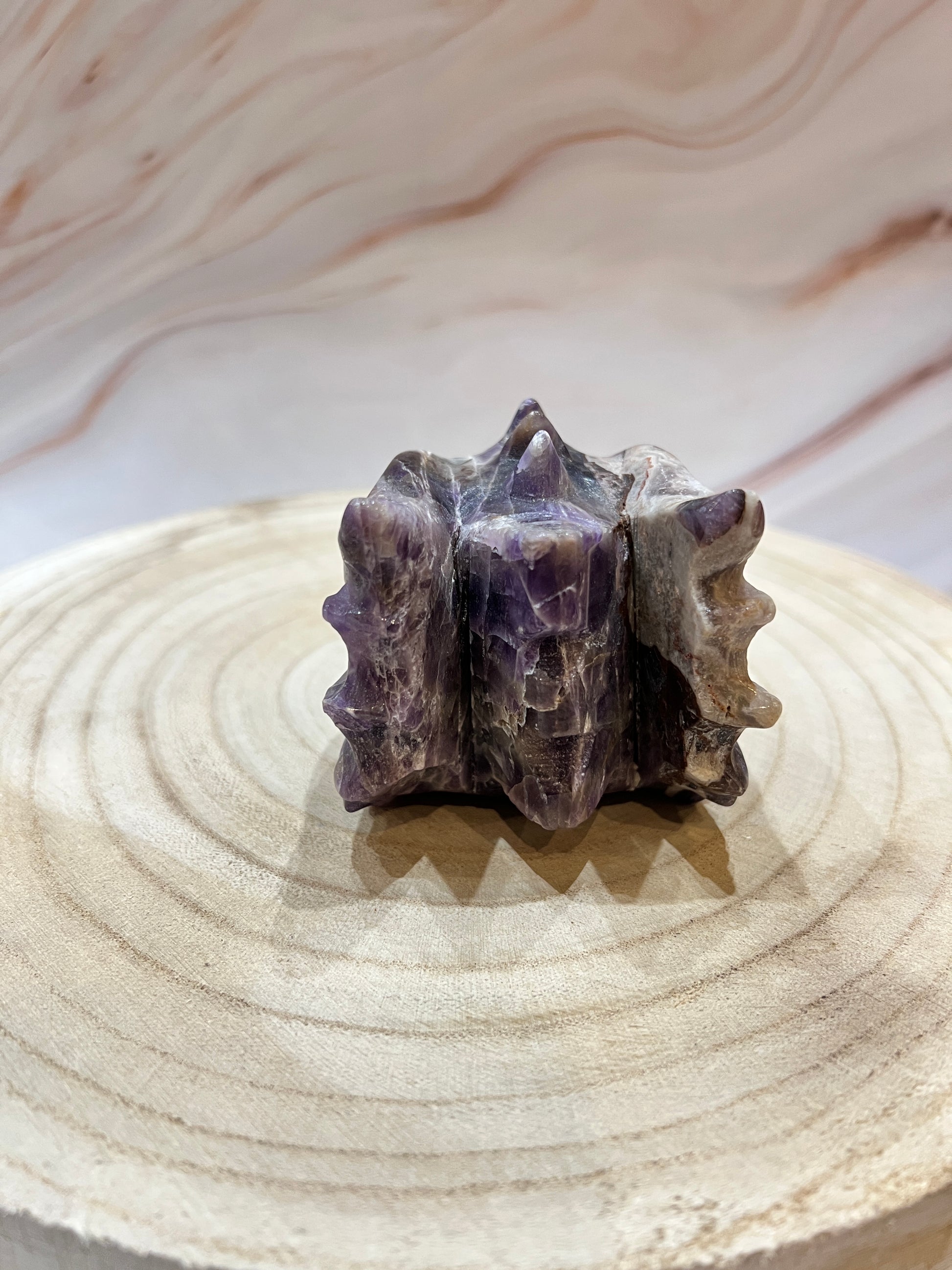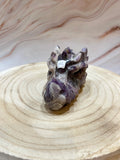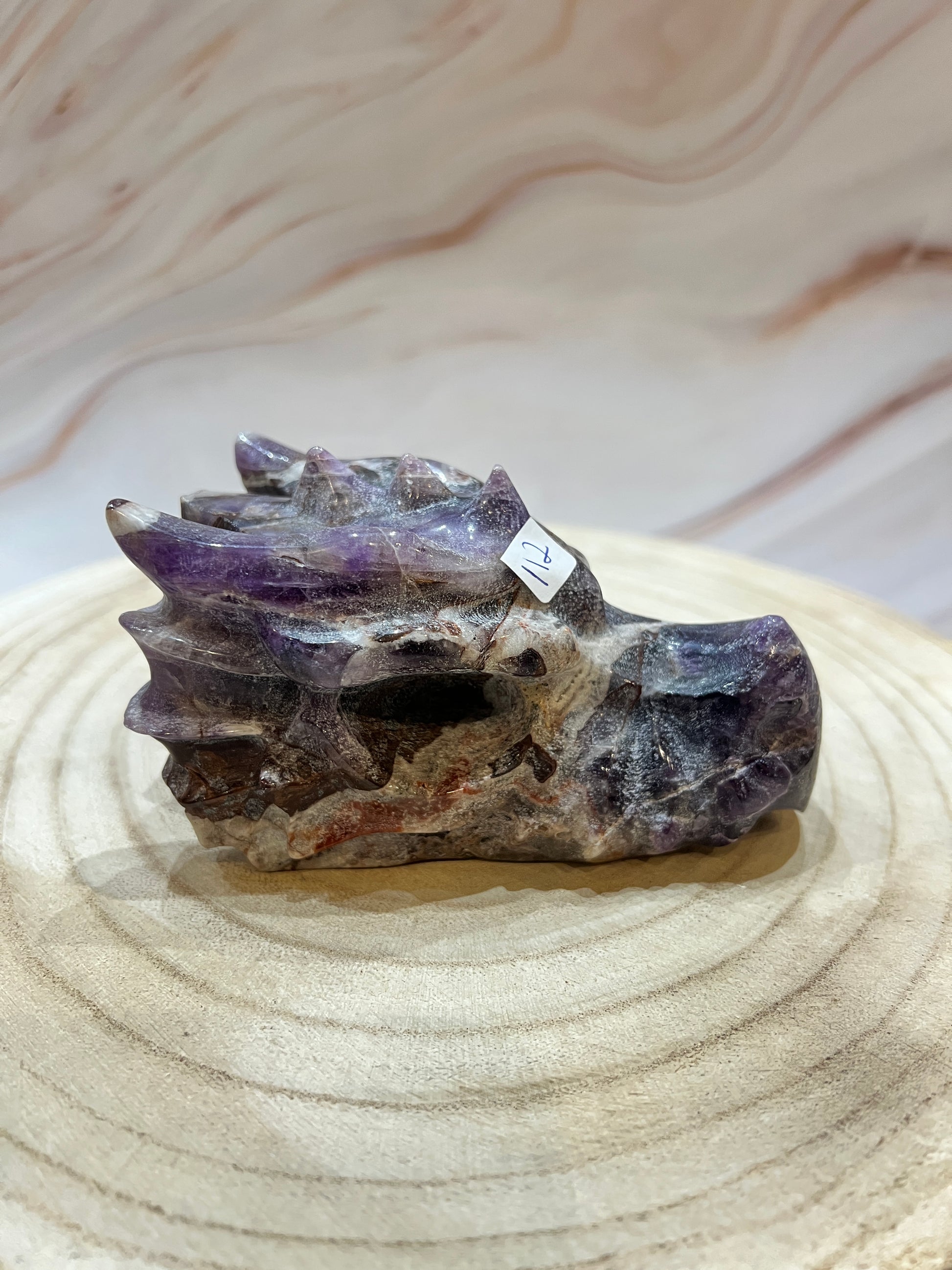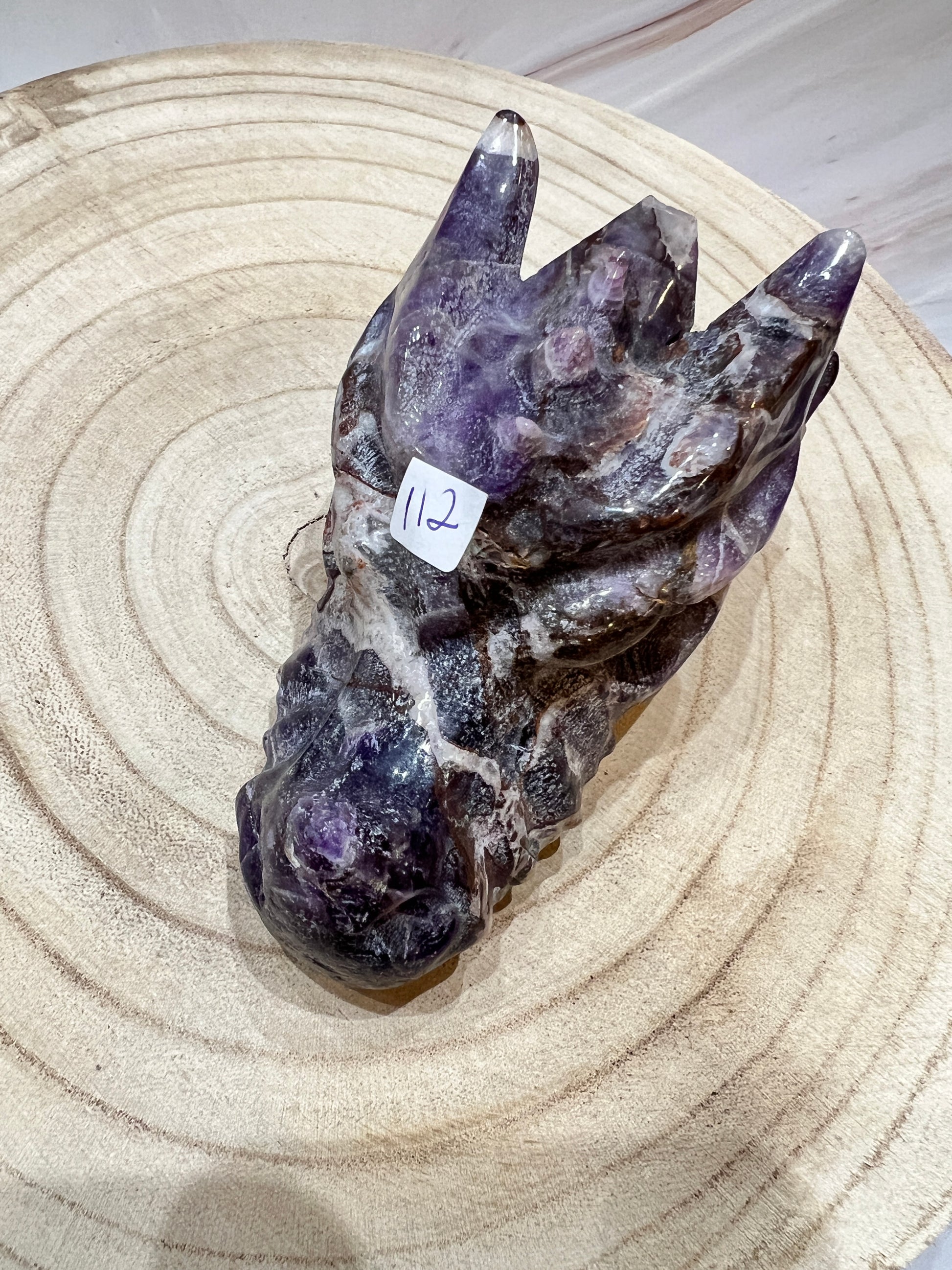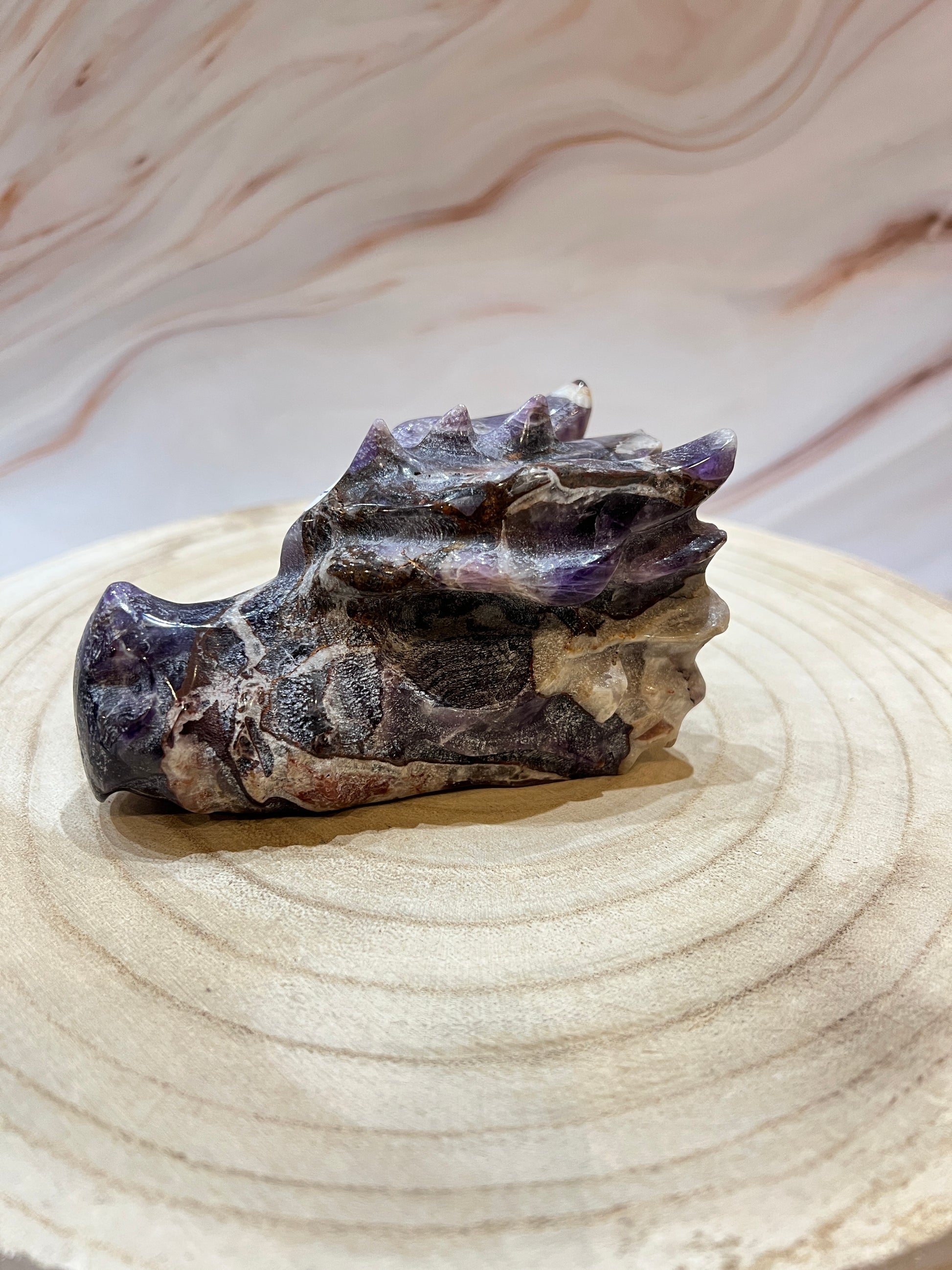 ✨ Eigenschappen: Krachtige handgesneden drakenkop van Chevron Amethist, ook bekend als Dream Amethist. Combineert de zuiverende energie van amethist met de versterkende werking van witte kwarts.
