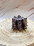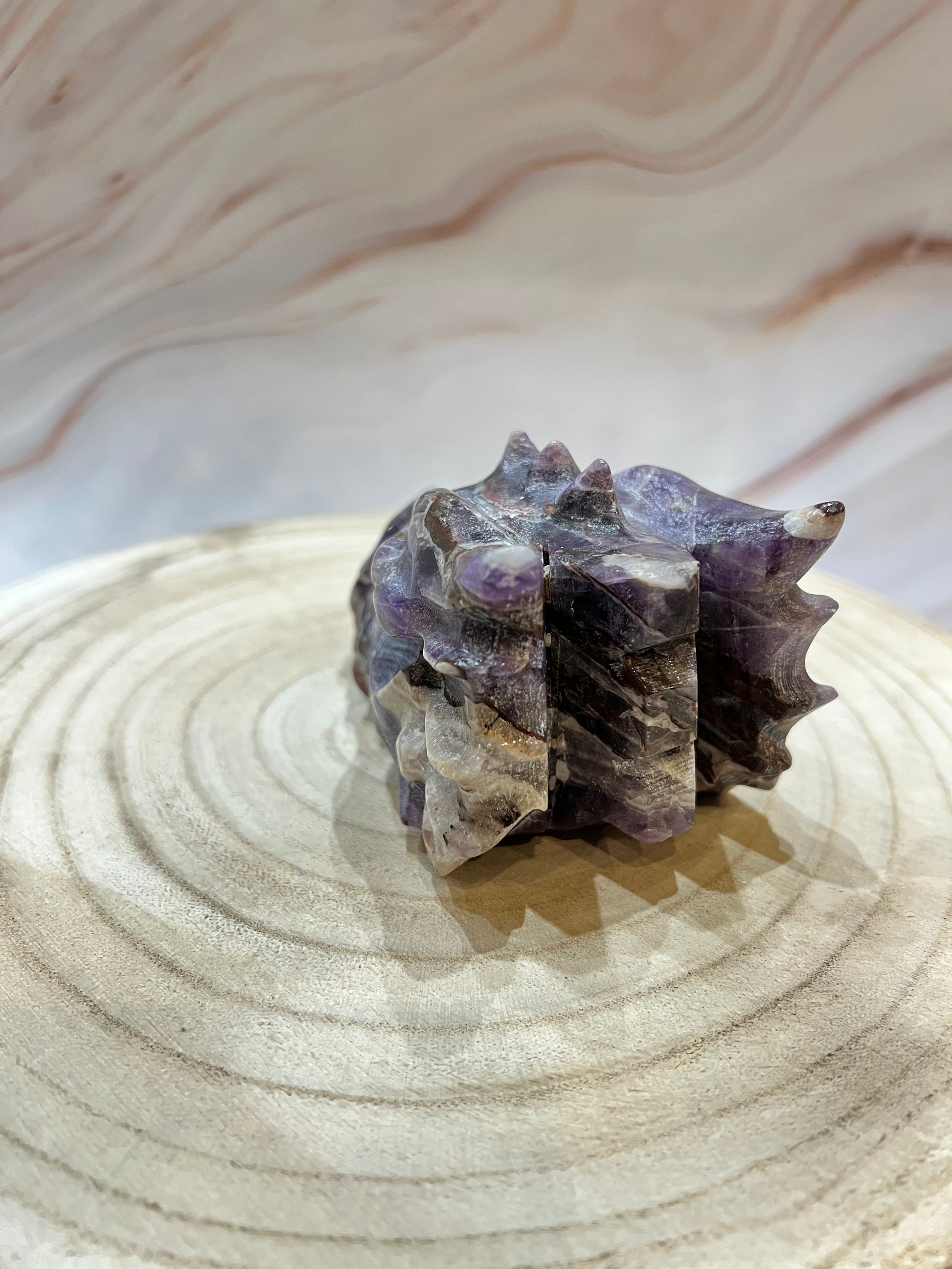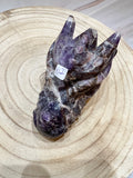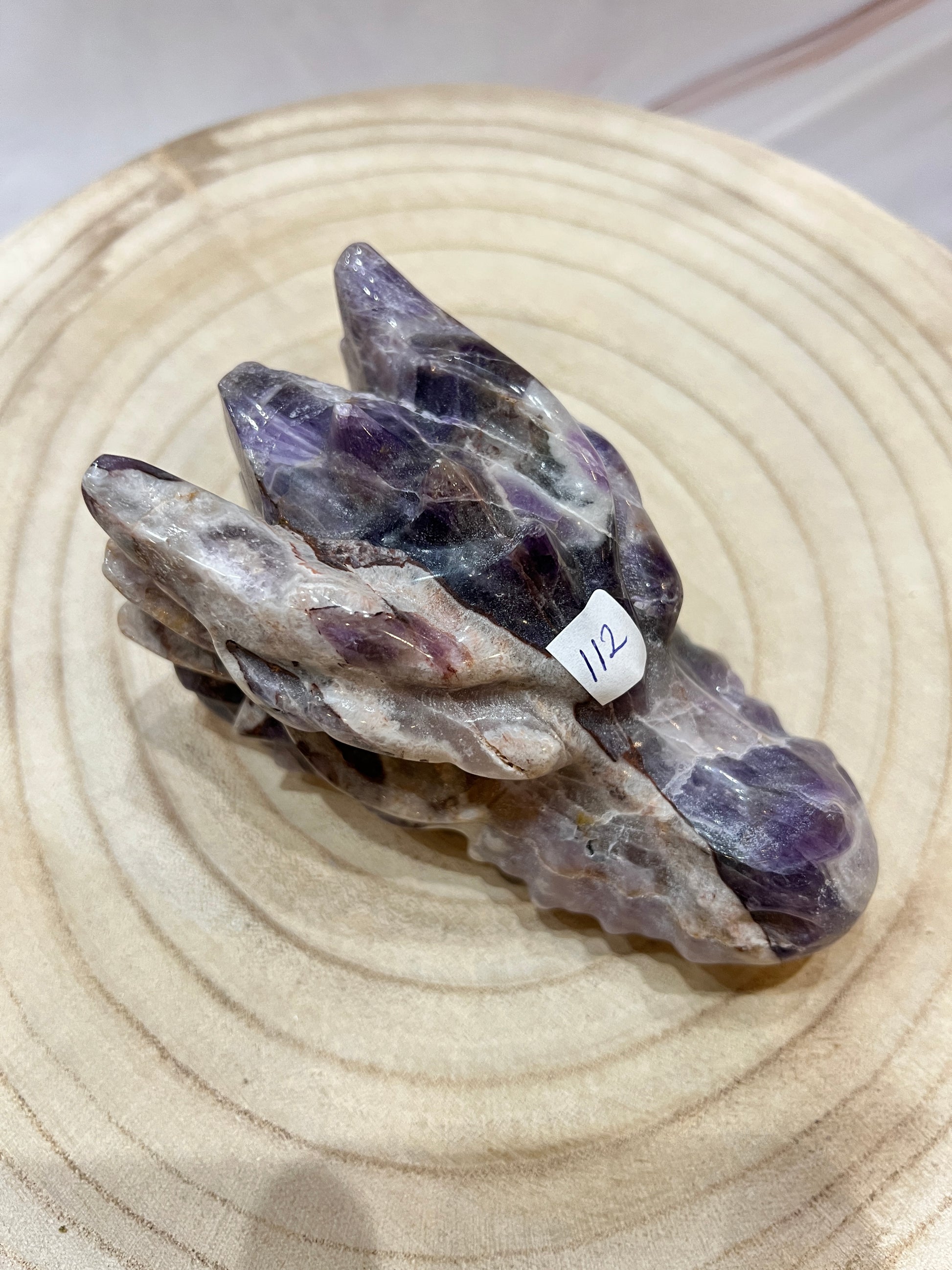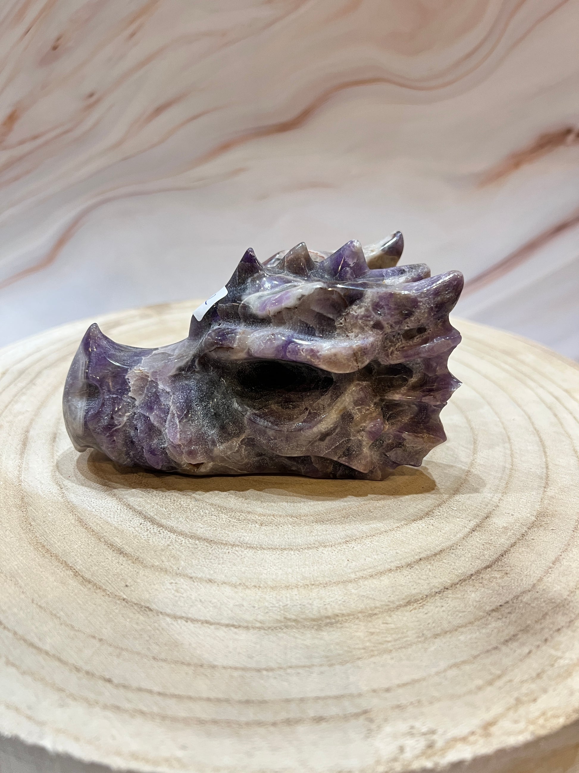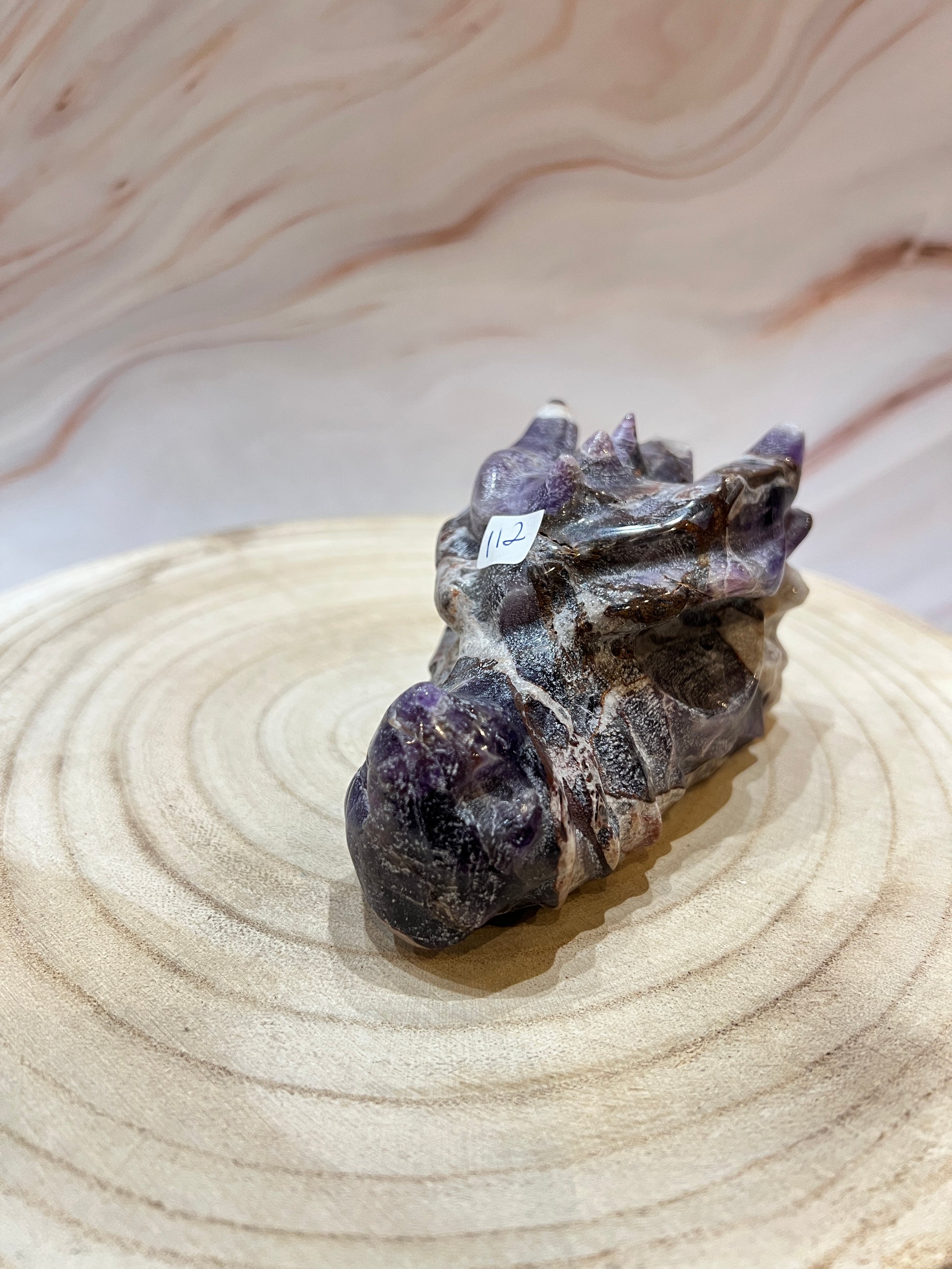 Chevron Amethist (Dream Amethist) Drakenkop – Handgesneden (11 cm | 622 g | €112 per stuk)