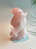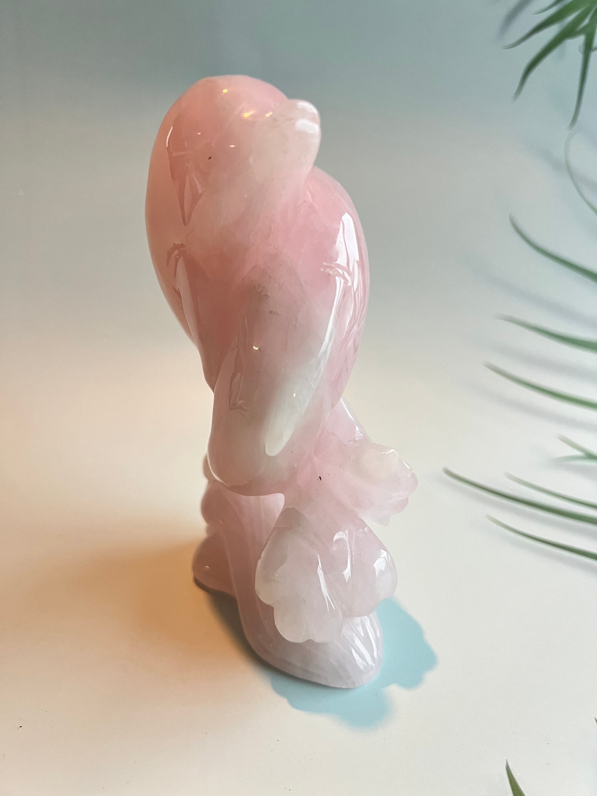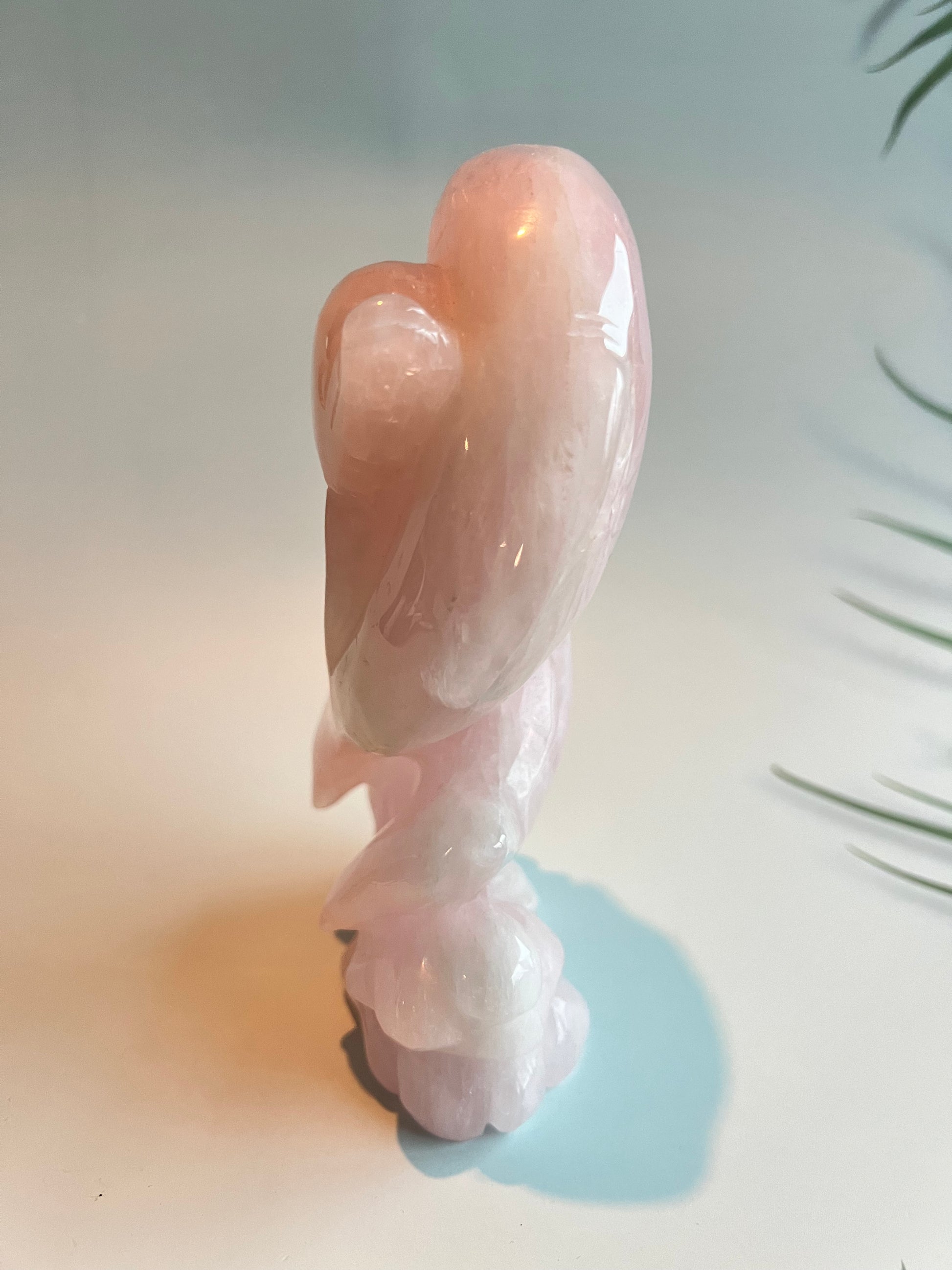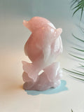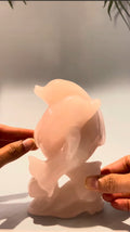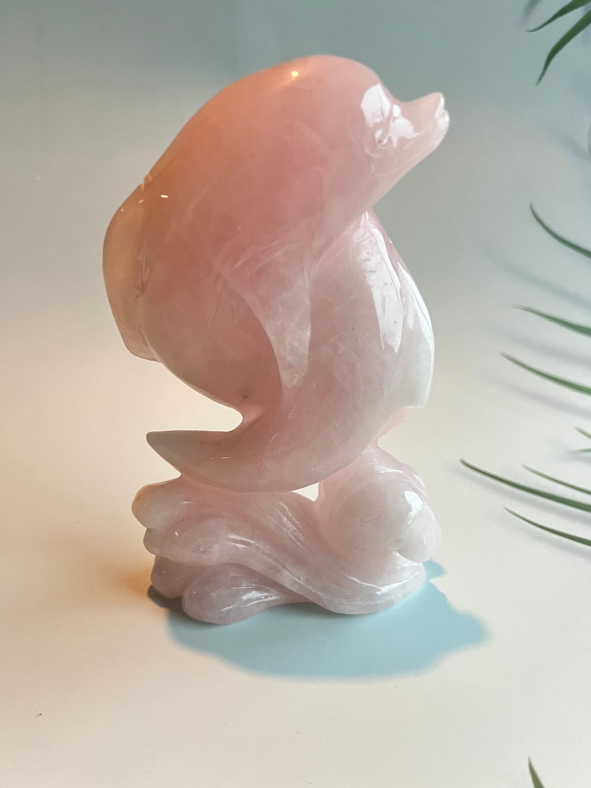 Twee dolfijnen 🐬🐬, liefdevol verstrengeld, omarmen elkaar op een rots. Deze dolfijnen zijn gemaakt van Rozenkwarts, de steen van onvoorwaardelijke liefde en compassie 💖. Rozenkwarts opent het hart voor liefde in al haar vormen – voor jezelf, voor anderen en voor de wereld om je heen. Het is een zachte, maar krachtige energie die troost, harmonie en vergeving bevordert.