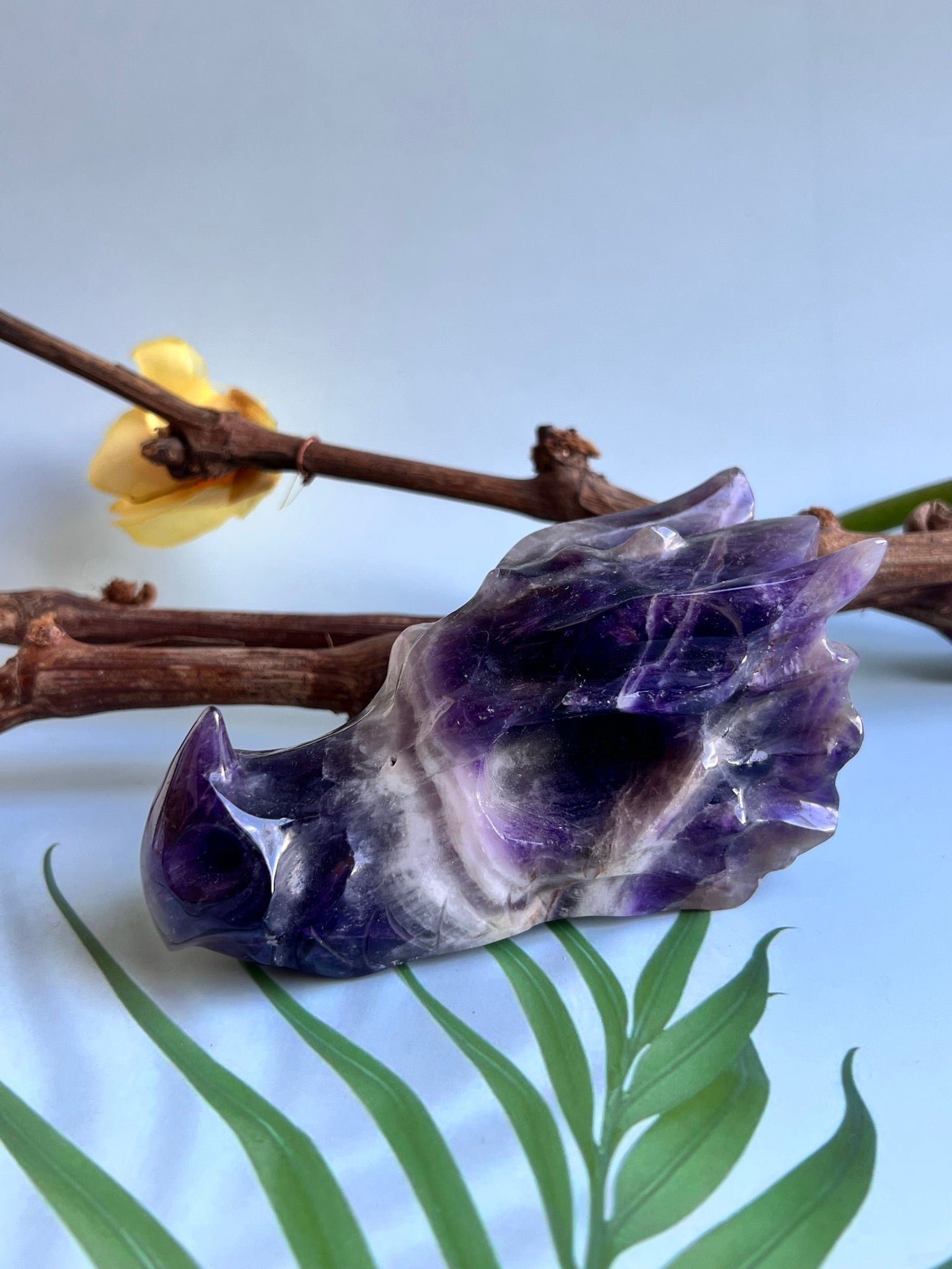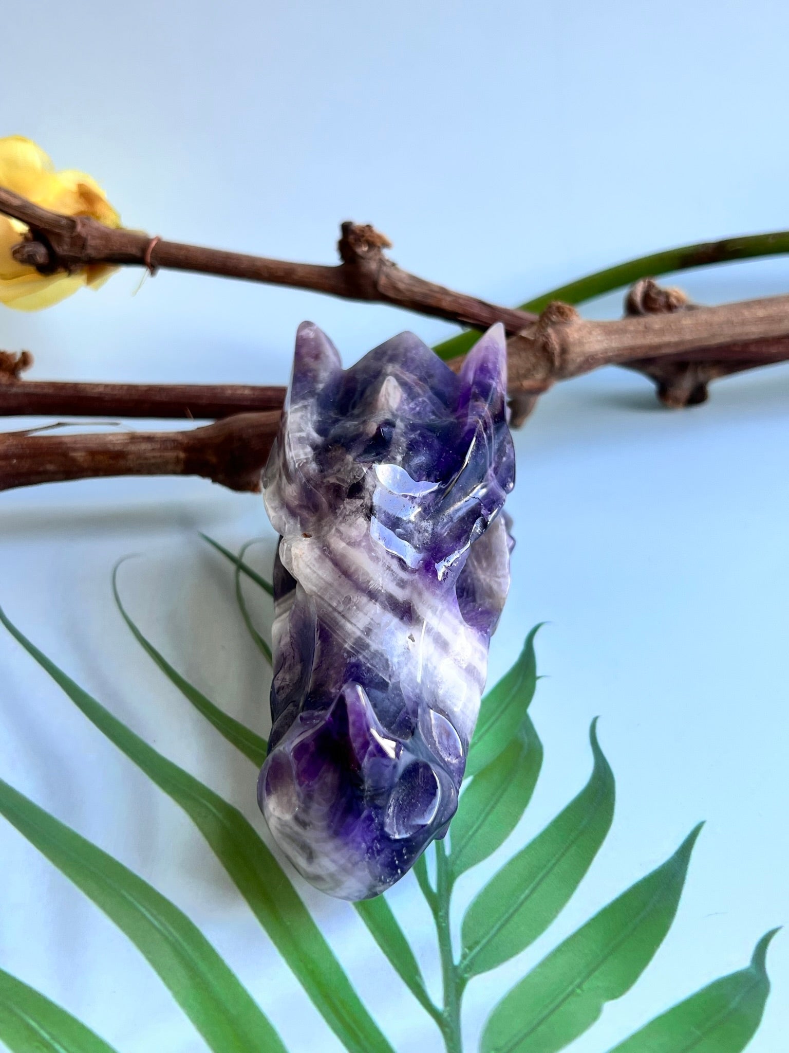 Deze draken skull combineert de kalmerende energie van amethist met de magie van draken. Het bevordert spirituele groei, intuïtie en dromen. Ideaal voor meditatie en het openen van het derde oog.