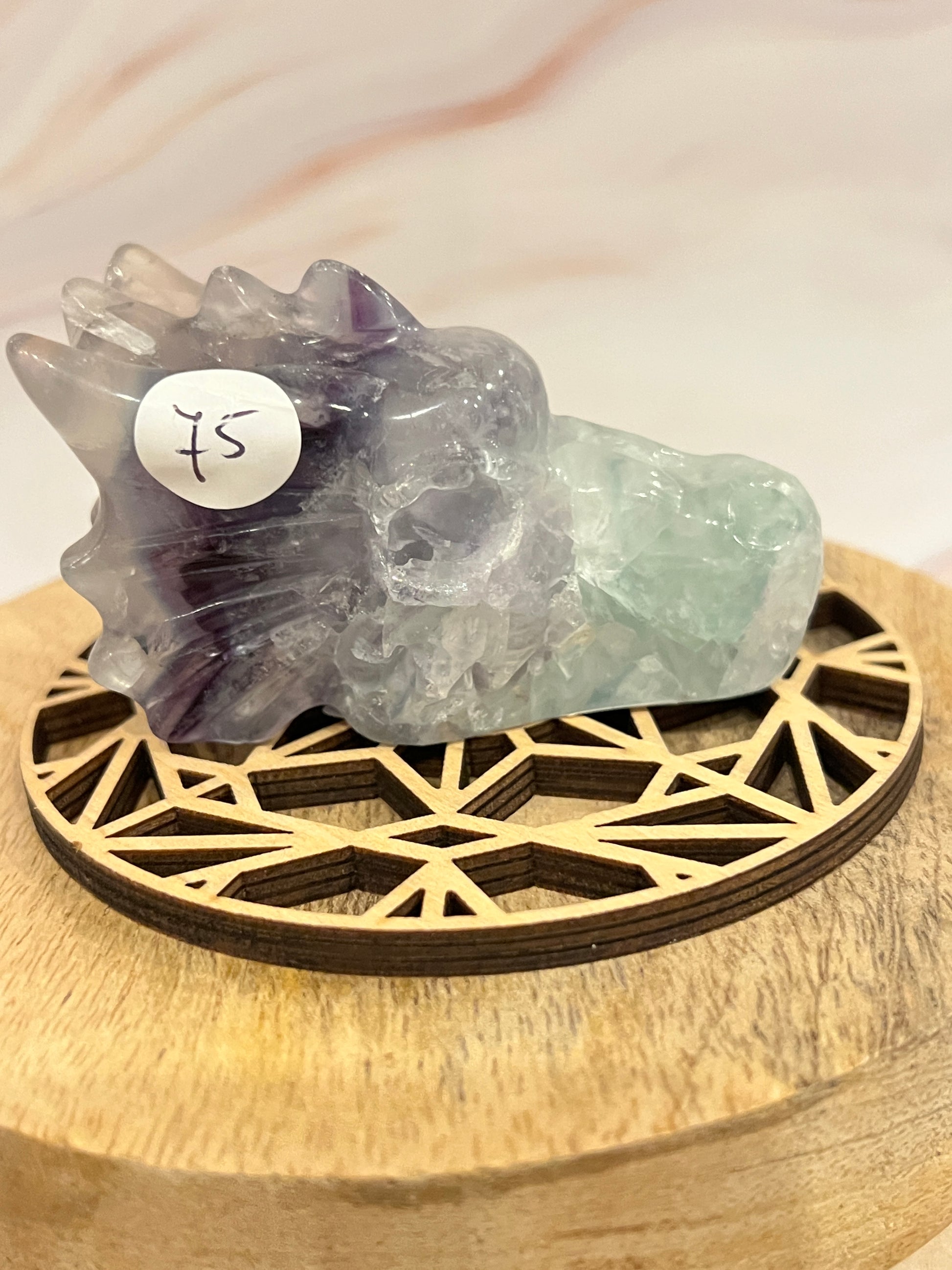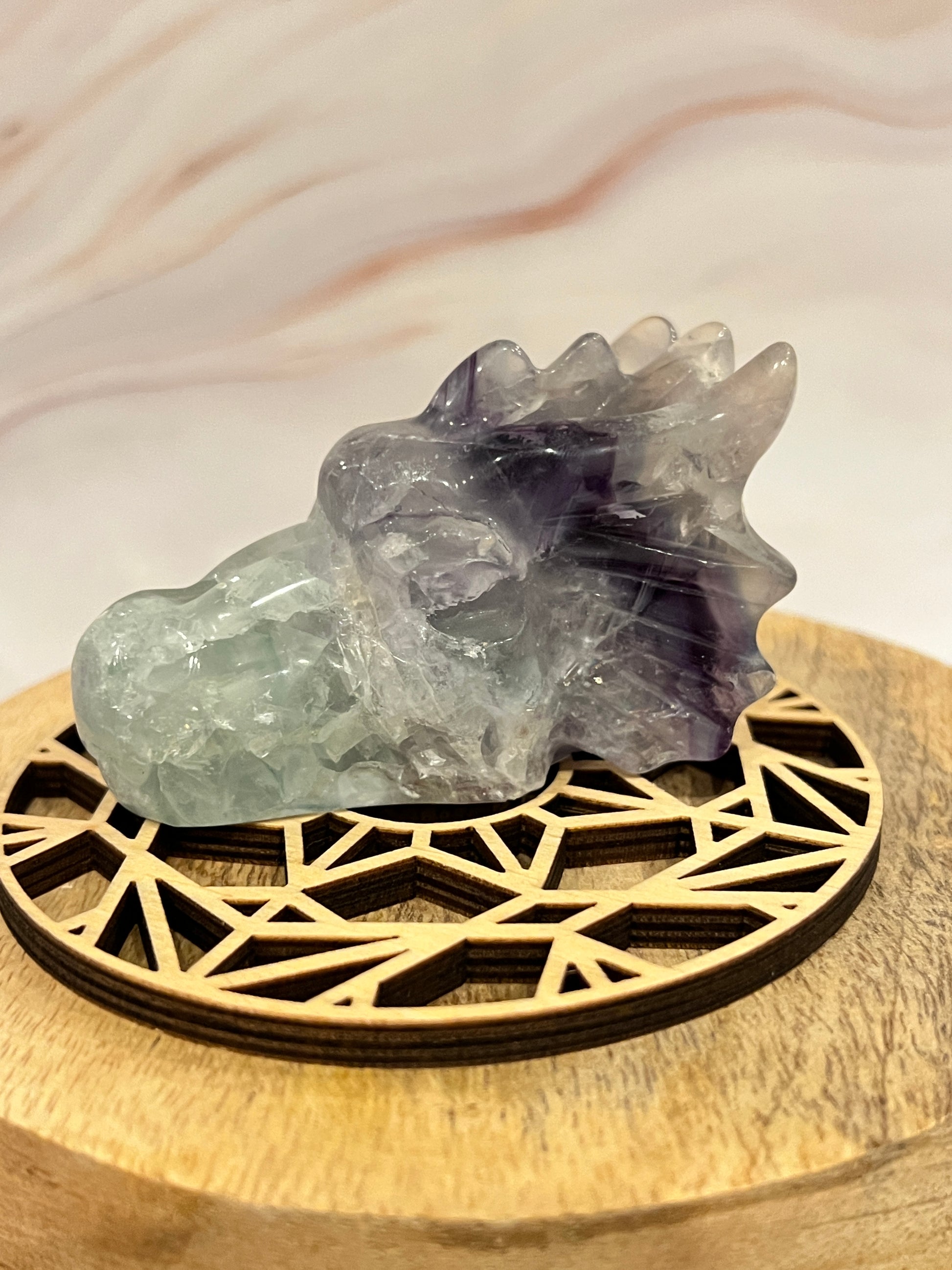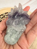 🐉 Fluoriet Drakenkop met Paarse Band – Wijsheid, Bescherming & Intuïtie