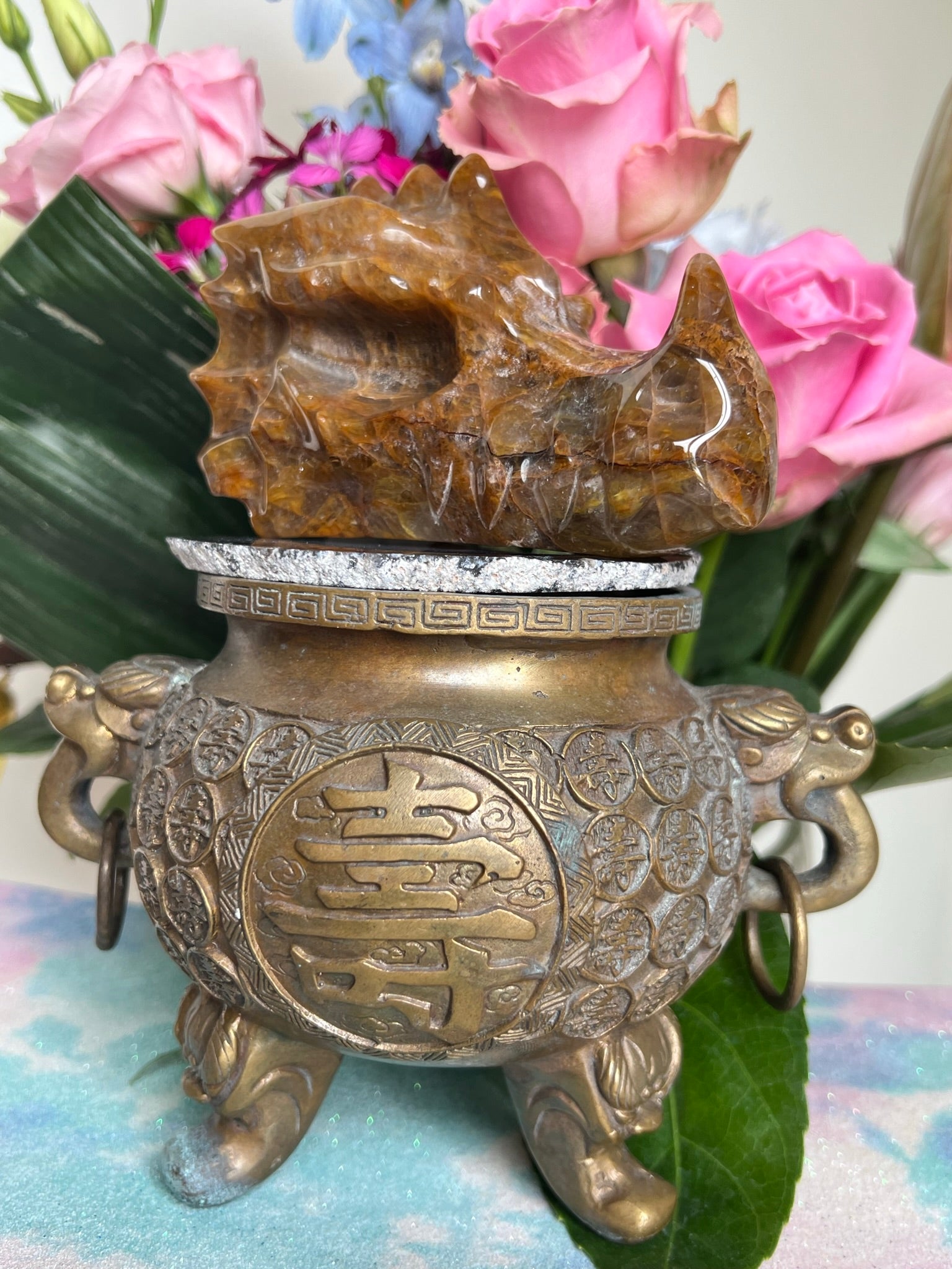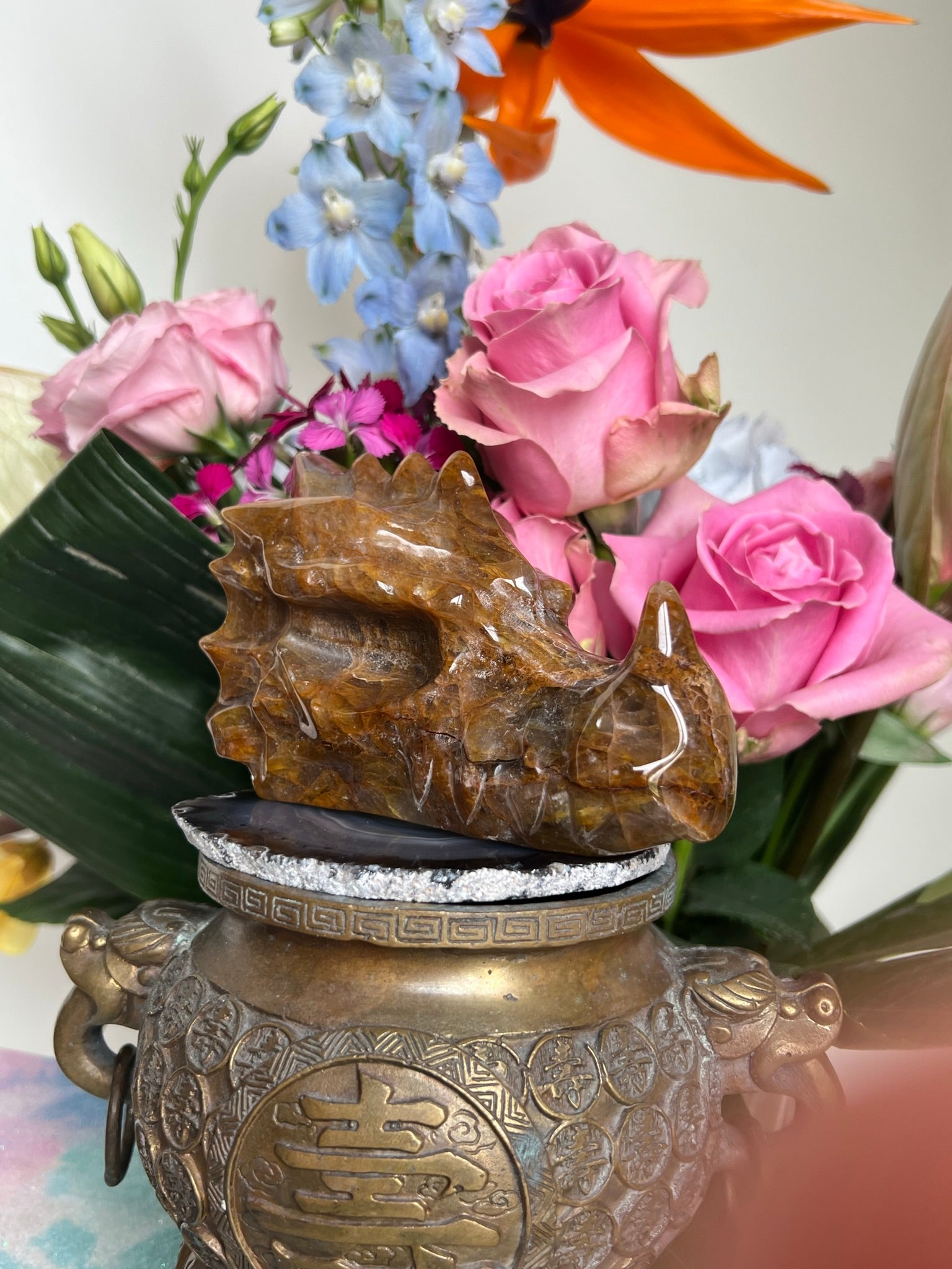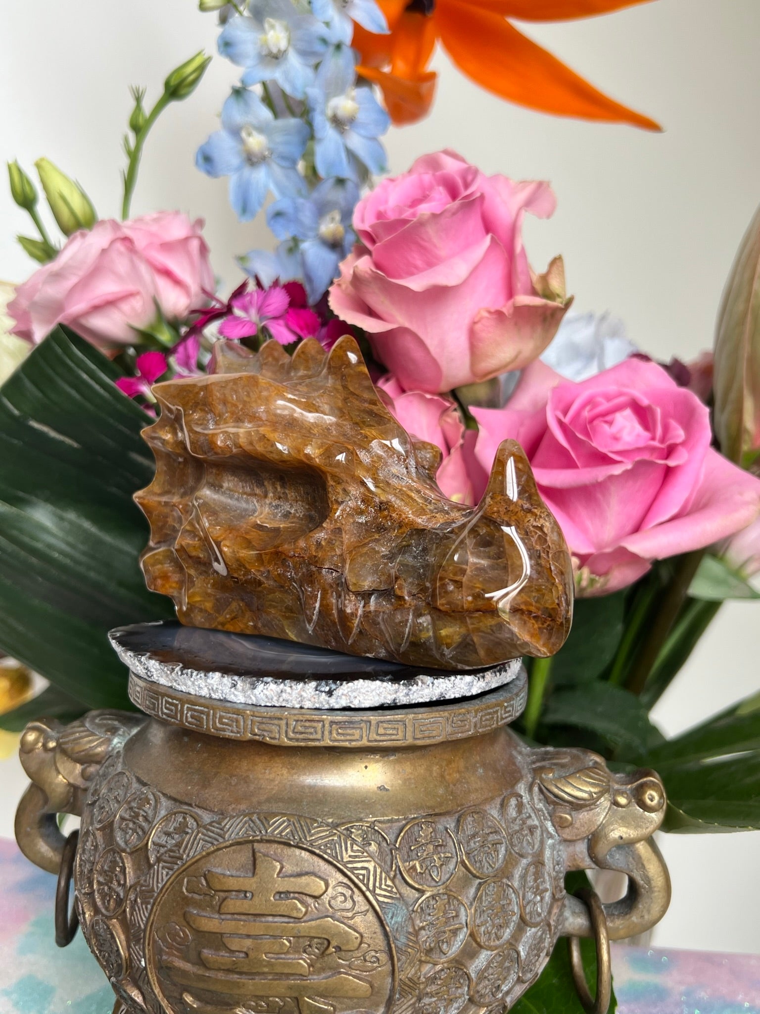 De Golden Healer werkt als een krachtige healer en brengt harmonie en spirituele groei. Deze draken skull versterkt de intenties van de steen en helpt je om diepe heling te ervaren. Geschikt voor alle chakra's en spiritueel werk.