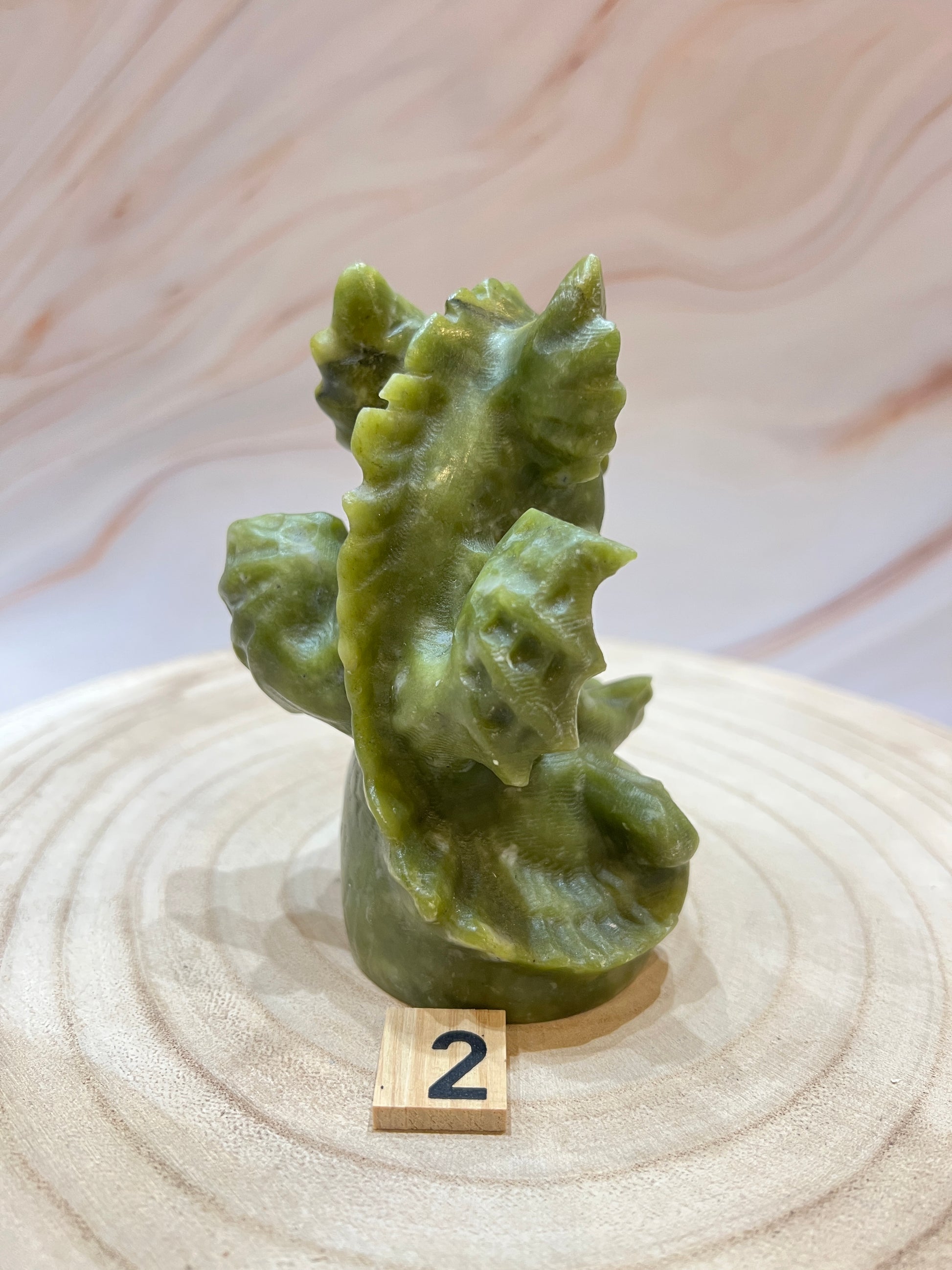 ✨ Eigenschappen: Prachtige handgesneden staande draken van groene jade. Stralen een liefdevolle, zachte energie uit en kunnen een klein hartje in de handen houden.
