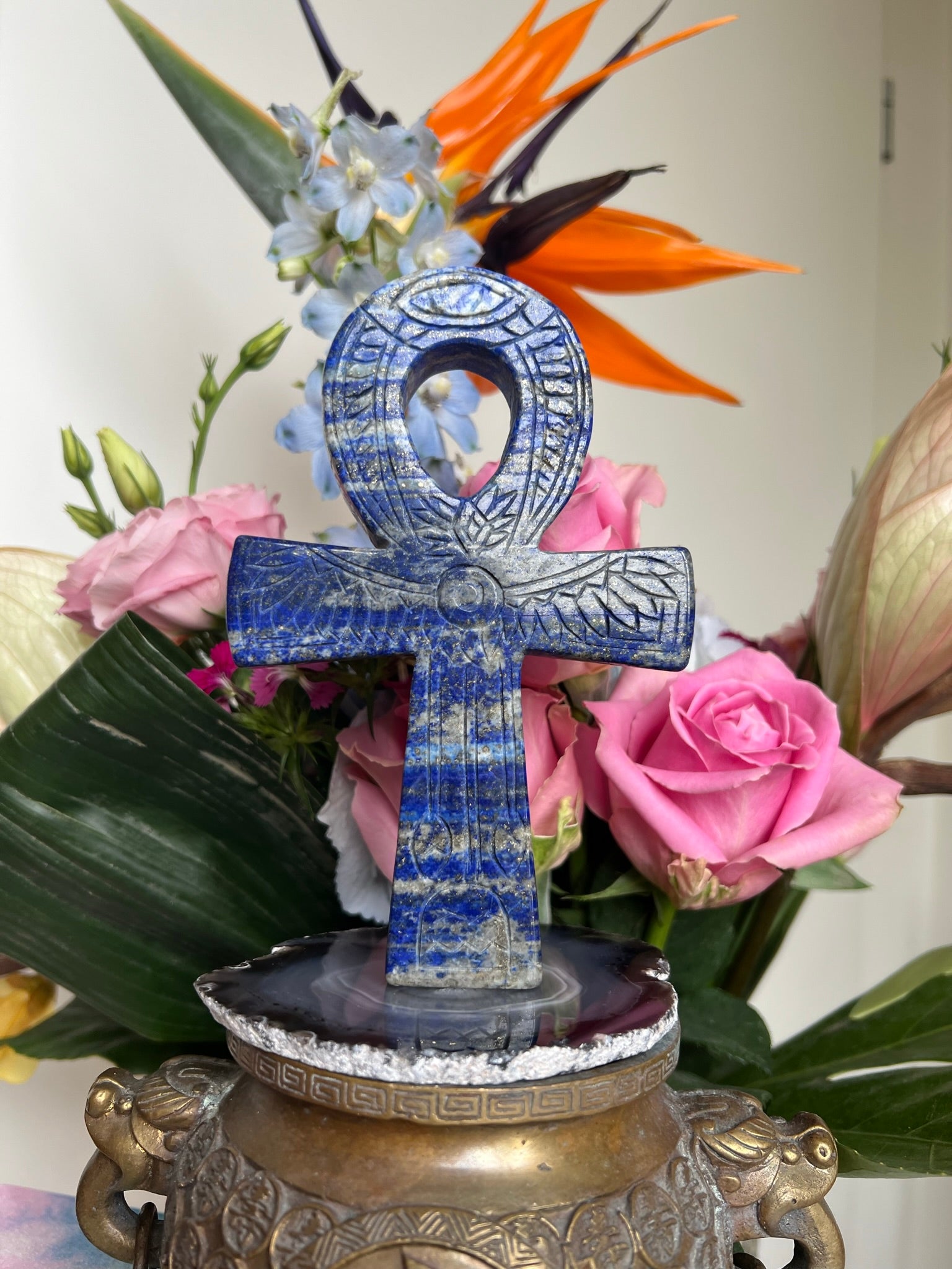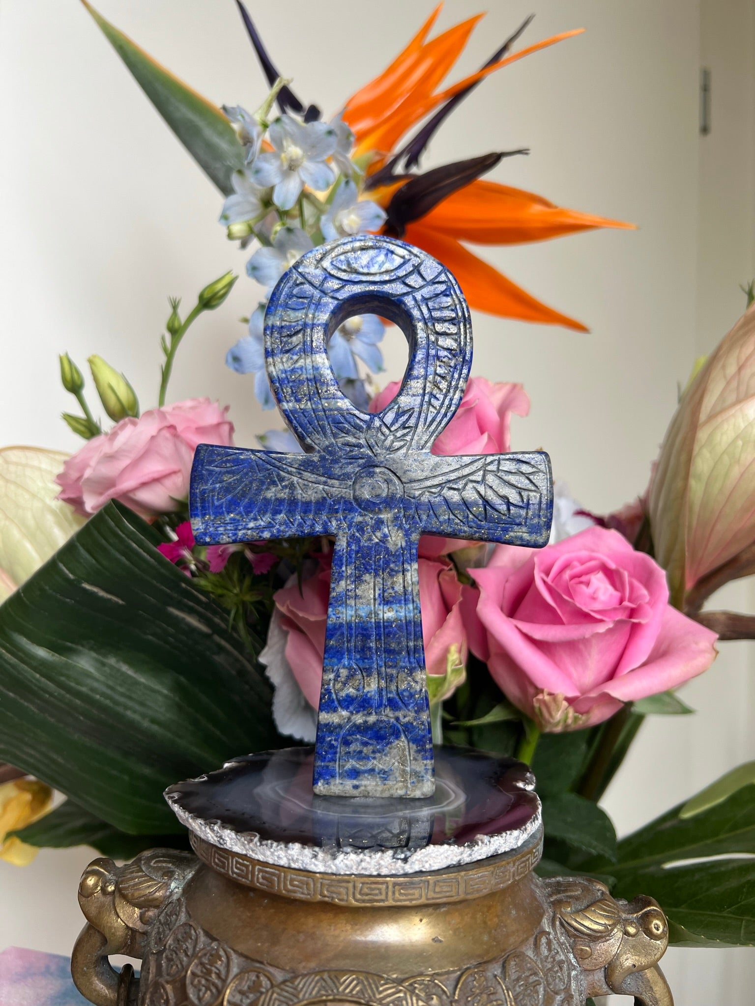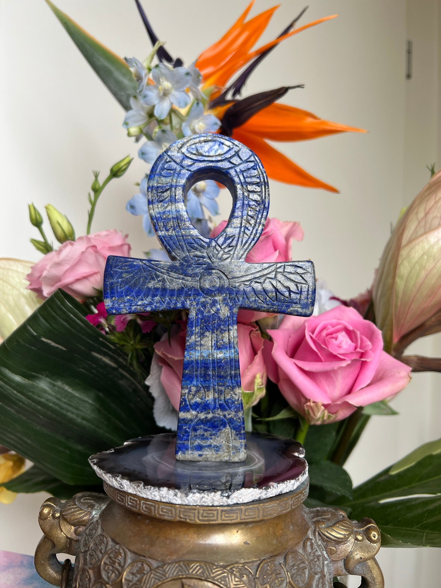 Duik in de diepten van wijsheid en innerlijke kracht met de Lapis Lazuli Ankh. Het diepe blauw van de Lapis Lazuli steen versterkt de betekenis van het Ankh-symbool, dat staat voor levenskracht en spirituele verbinding. Deze combinatie opent het derde oogchakra en stimuleert spirituele groei en intuïtie.