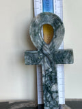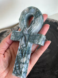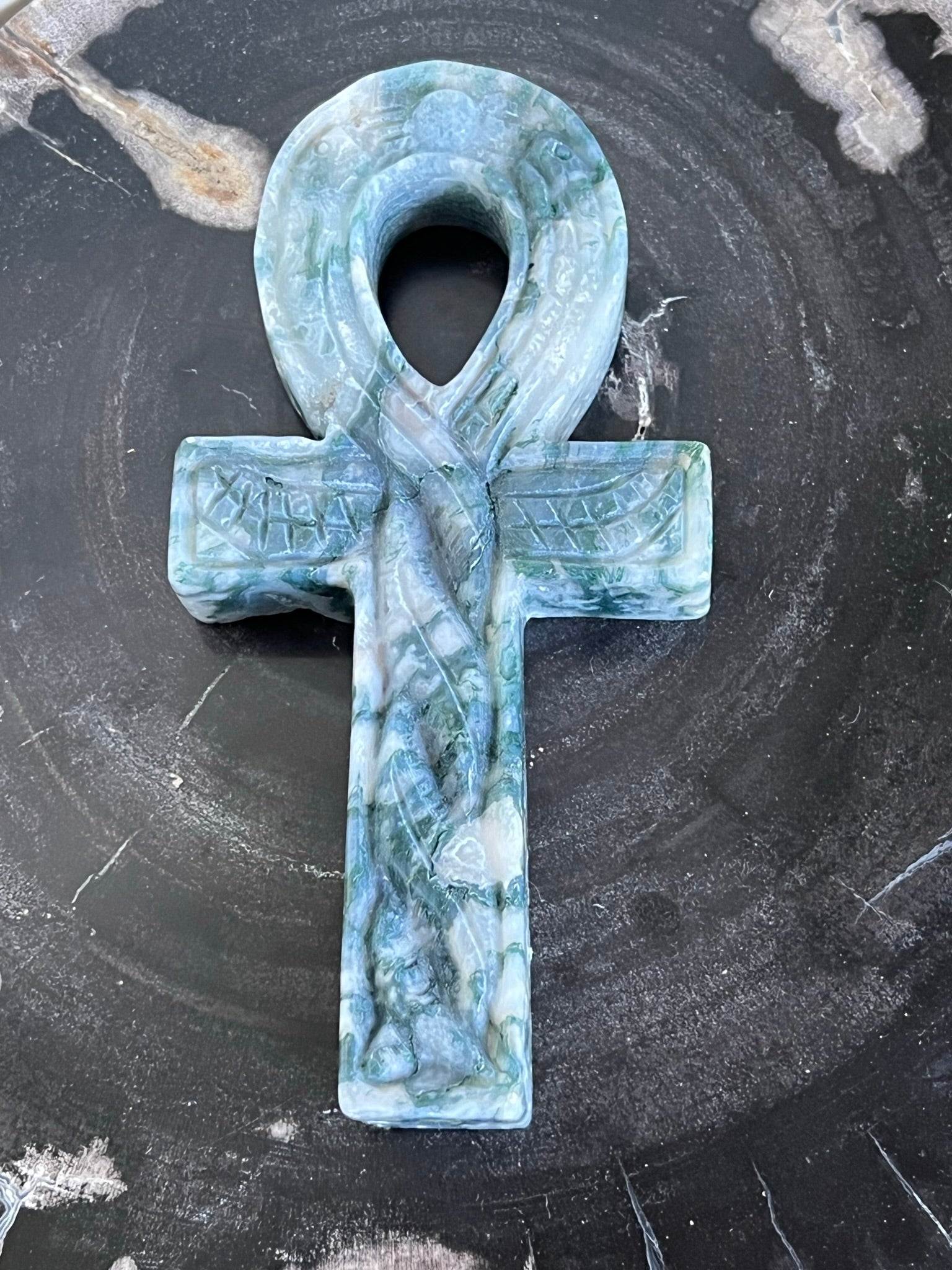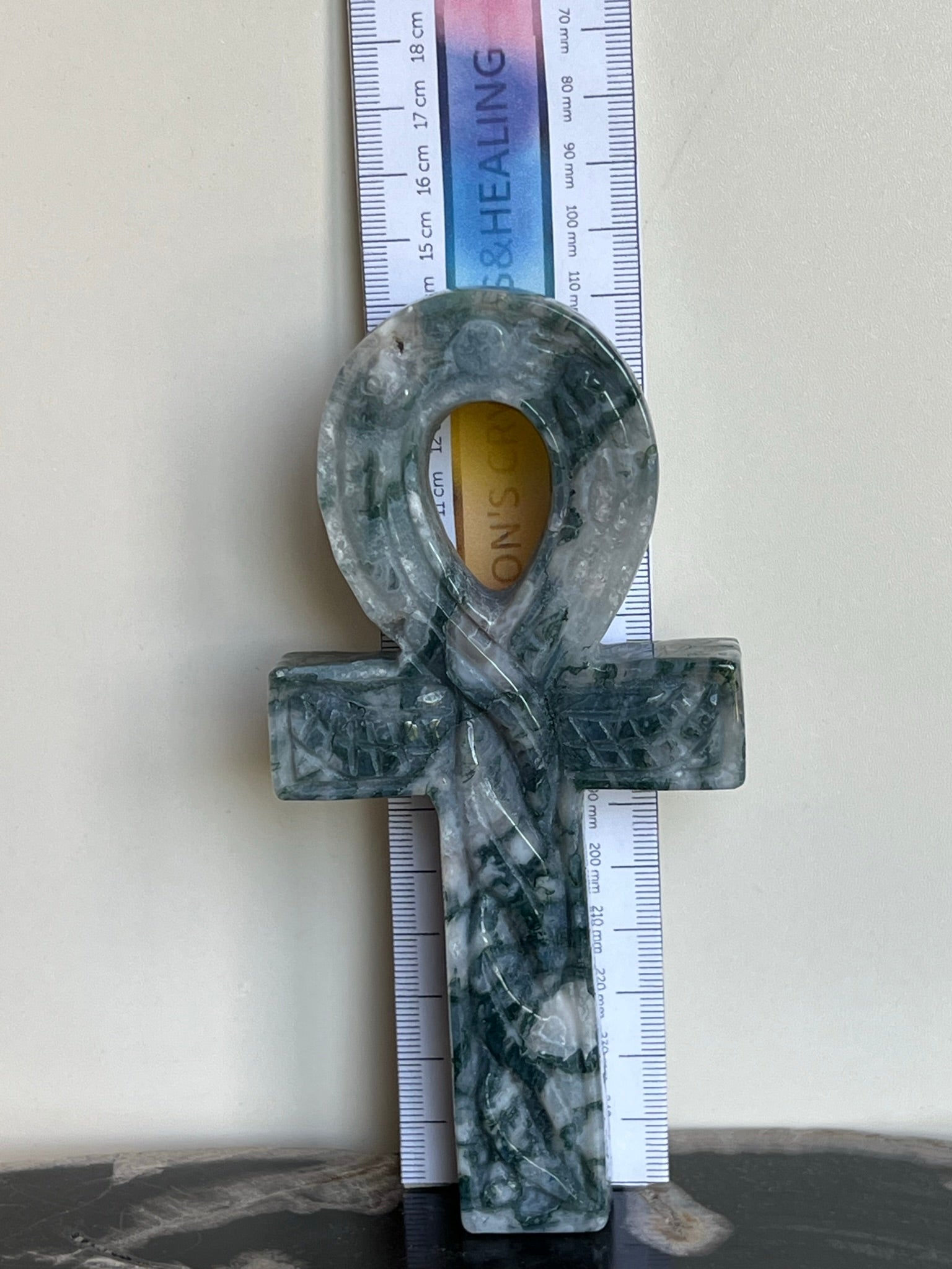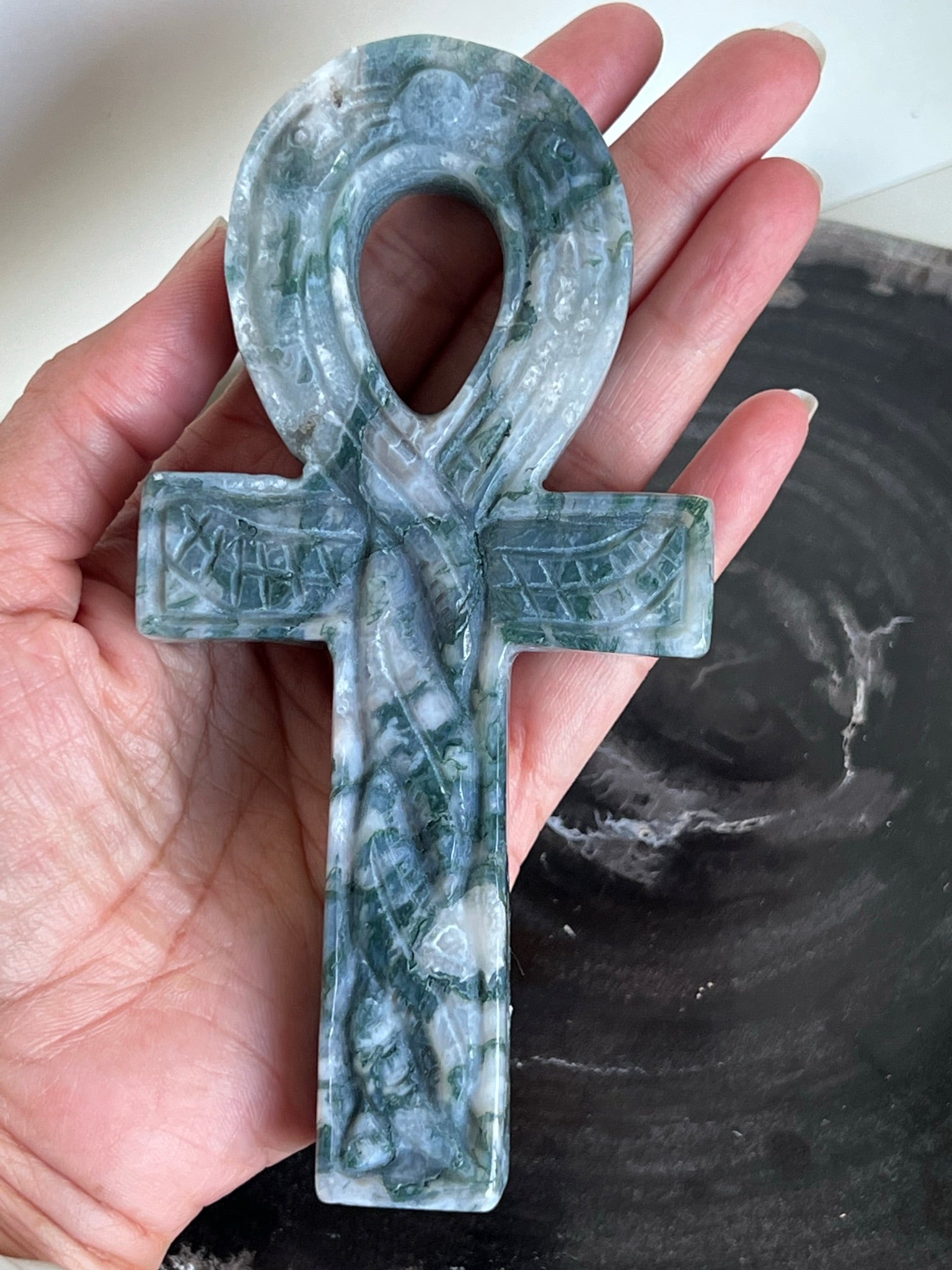 Verbind je met de aarde en bevorder stabiliteit met de Mosagaat Ankh. Het aardse groen en bruin van de steen worden gecombineerd met het Ankh-symbool, dat staat voor levensenergie en spirituele kracht. Deze combinatie biedt aarding en bescherming tijdens je spirituele reis.