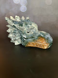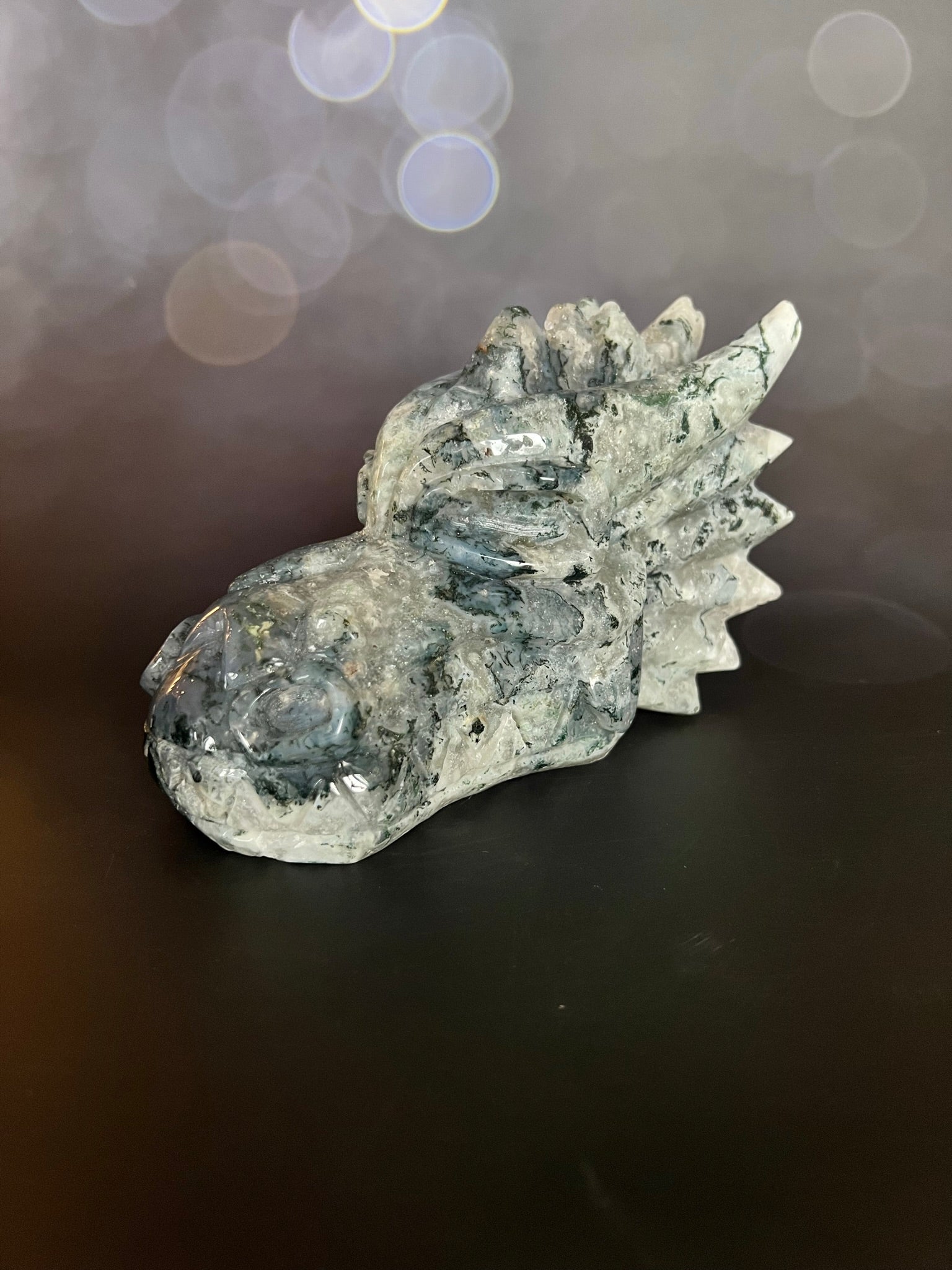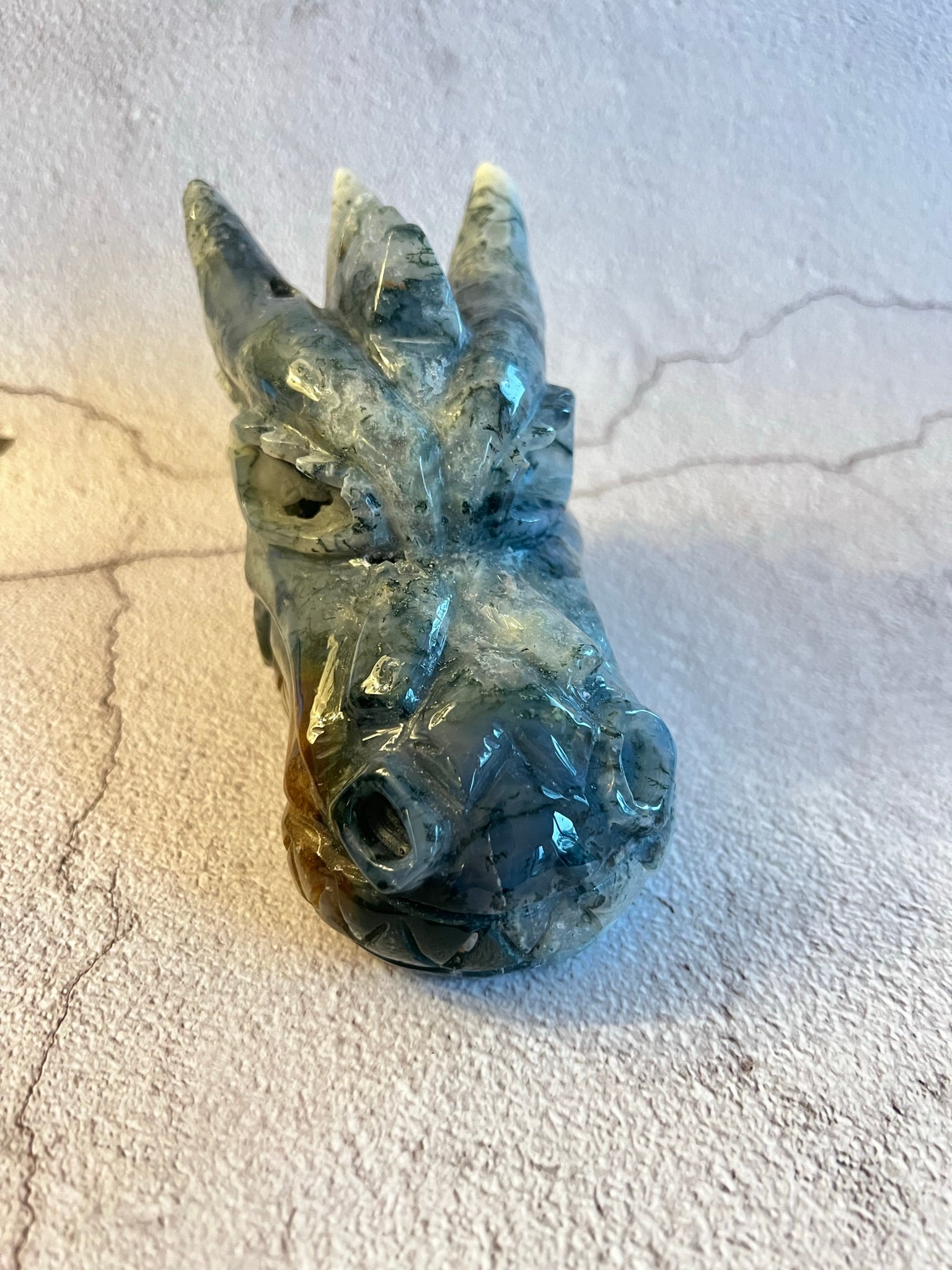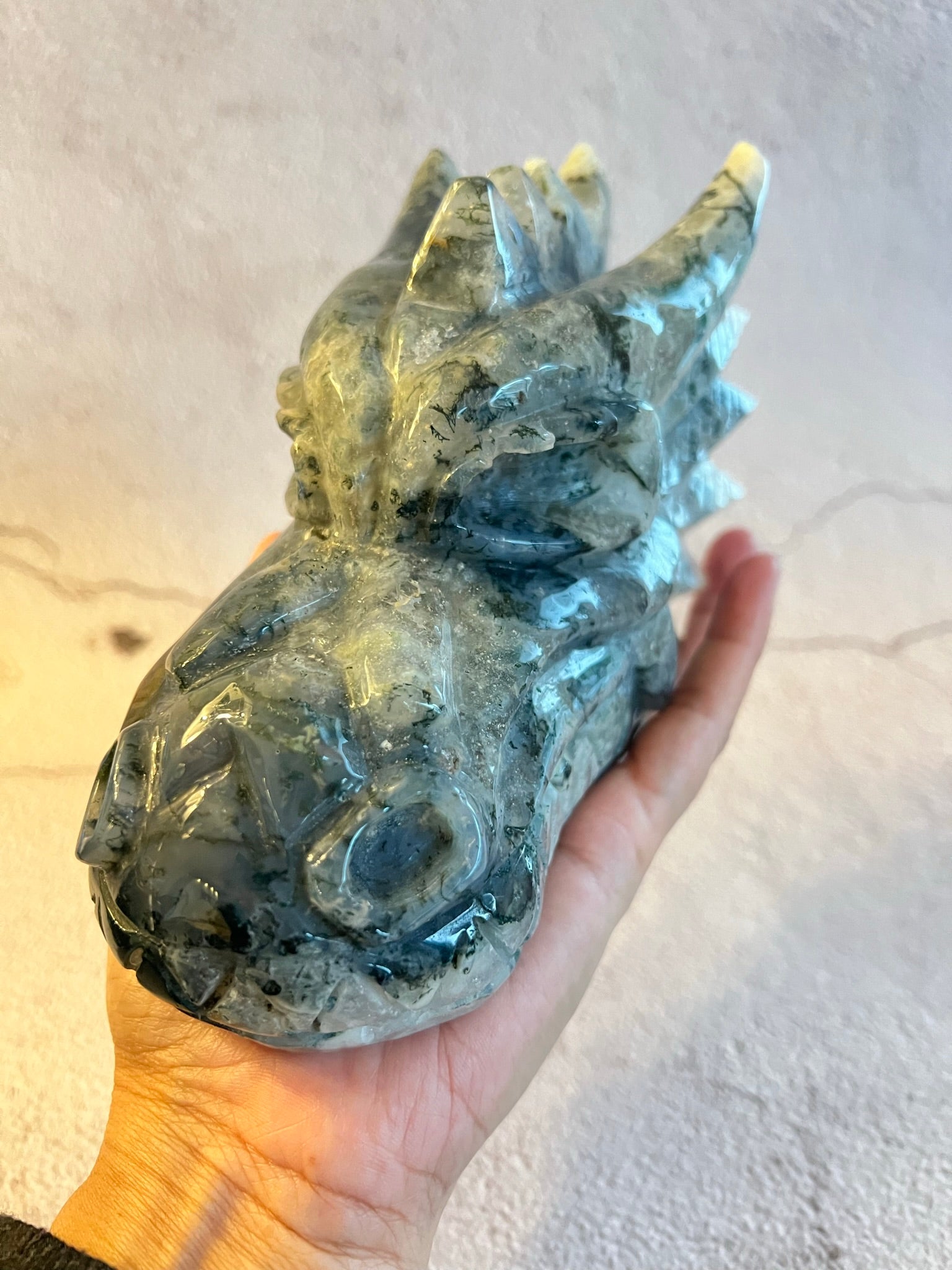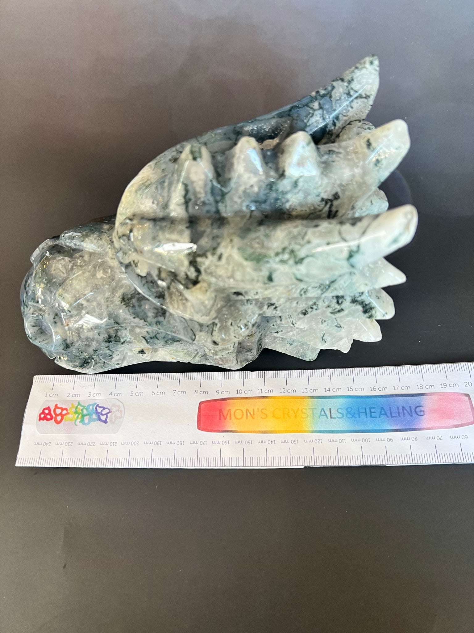 Deze prachtige blauwe mosagaat draak, met zijn majestueuze vorm en diepblauwe tinten, brengt niet alleen een vleugje elegantie in je leefruimte, maar ook helende energieën voor je lichaam en geest. Met een gewicht van 1,5 kg, voel je de aanwezigheid van deze draak in elke vezel van je wezen.