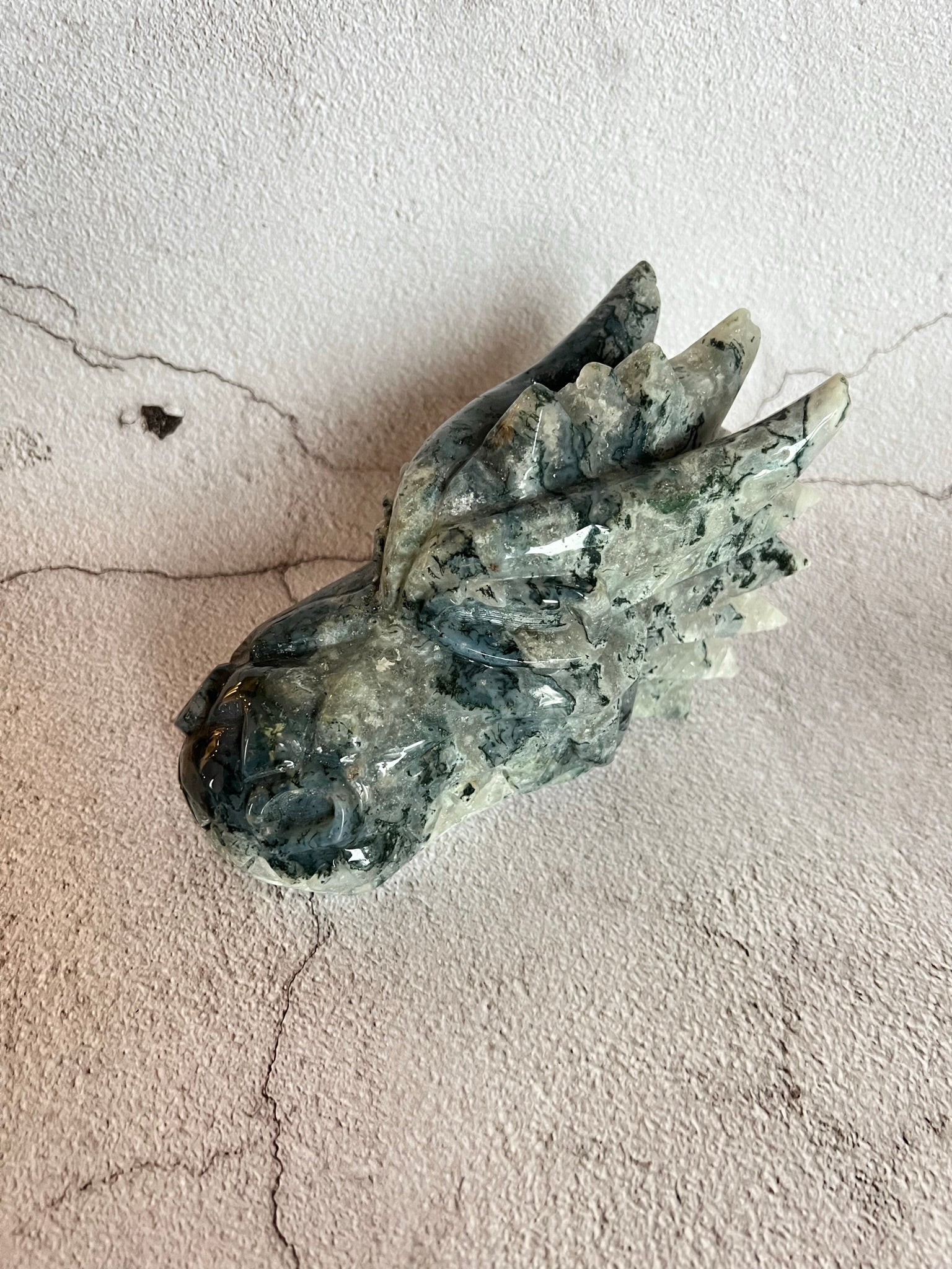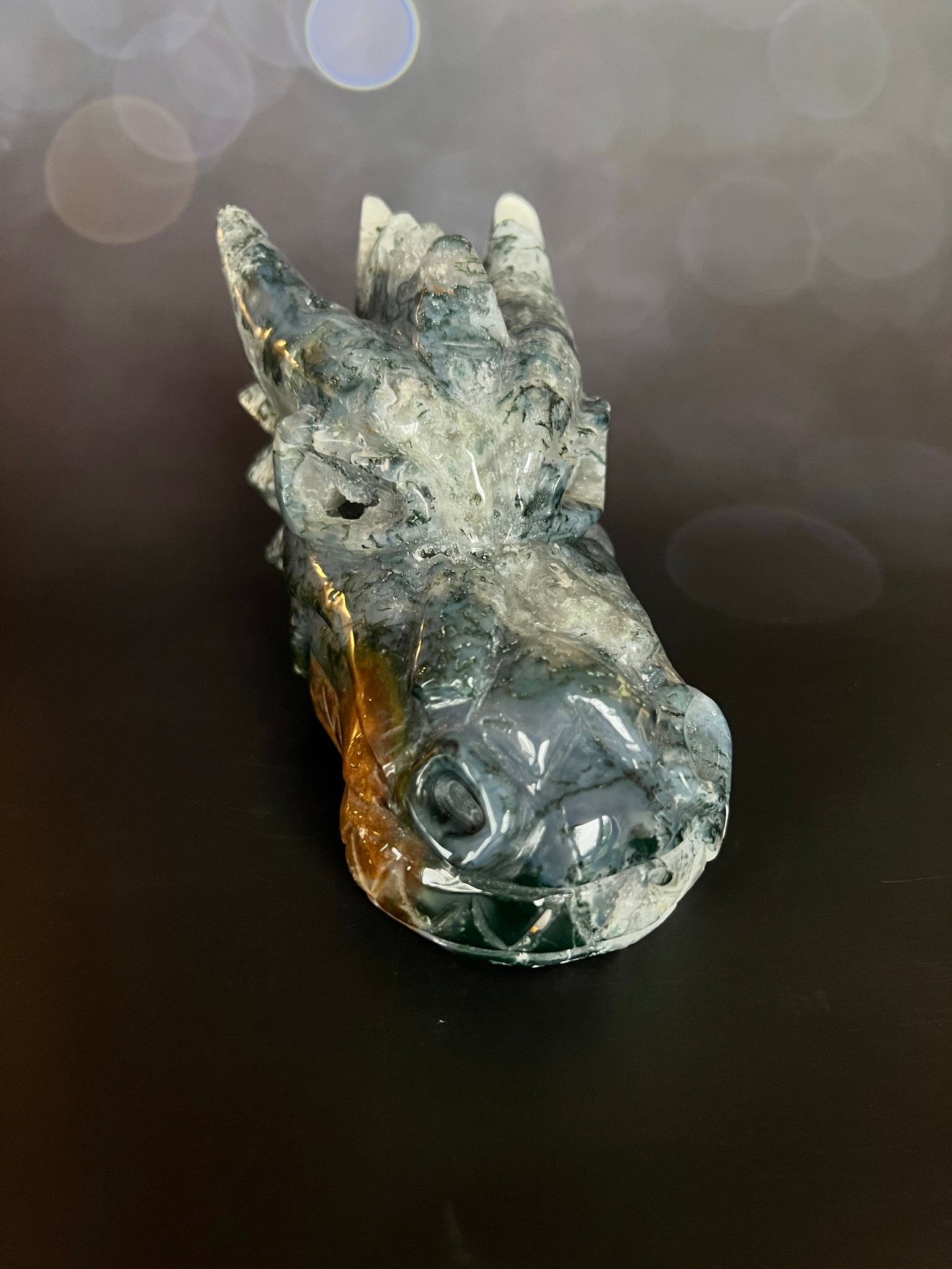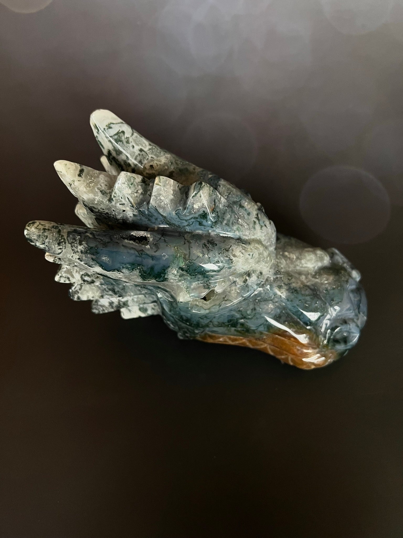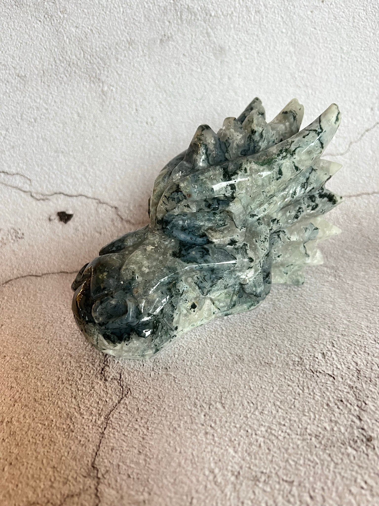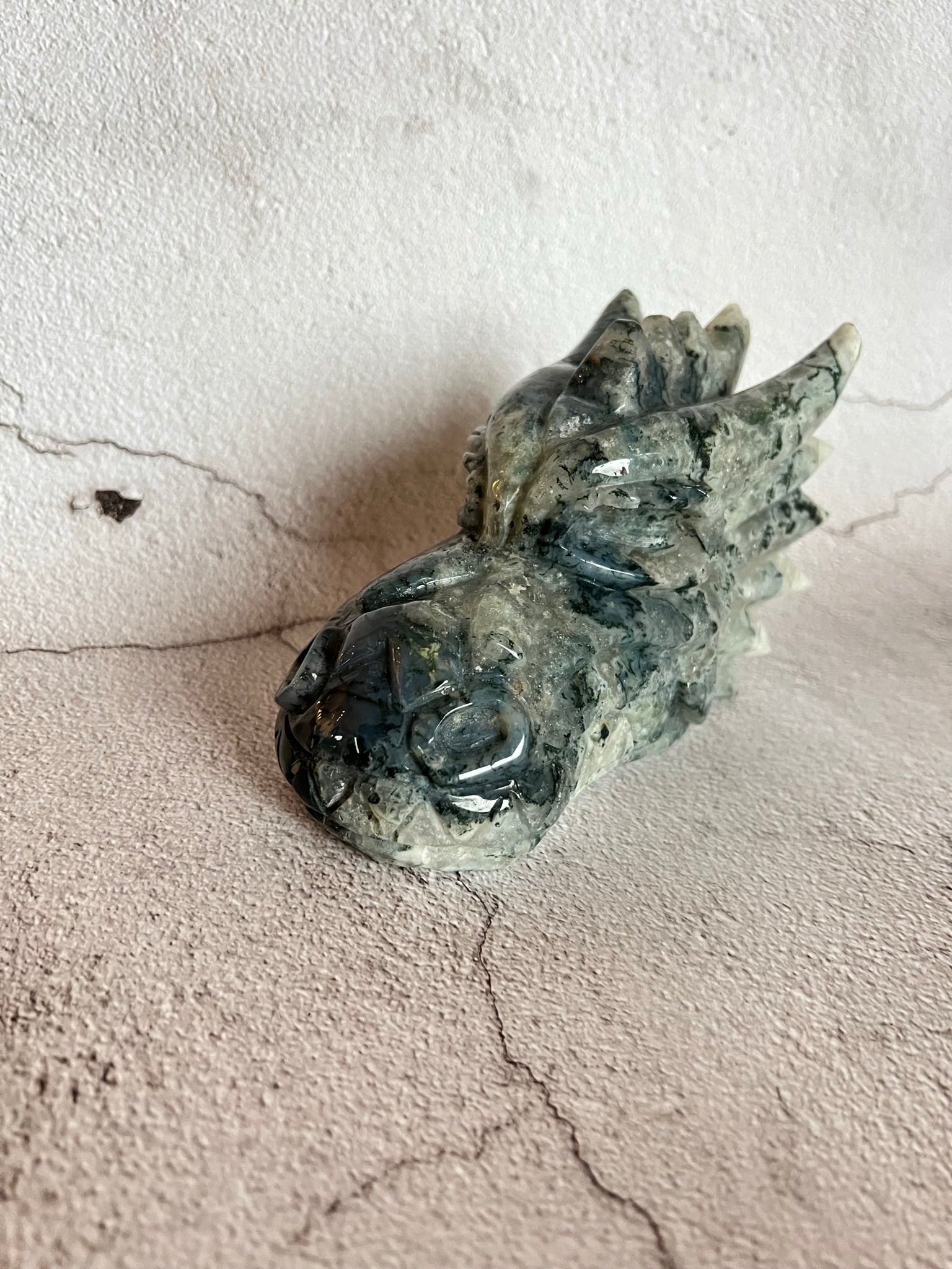 Deze prachtige blauwe mosagaat draak, met zijn majestueuze vorm en diepblauwe tinten, brengt niet alleen een vleugje elegantie in je leefruimte, maar ook helende energieën voor je lichaam en geest. Met een gewicht van 1,5 kg, voel je de aanwezigheid van deze draak in elke vezel van je wezen.