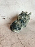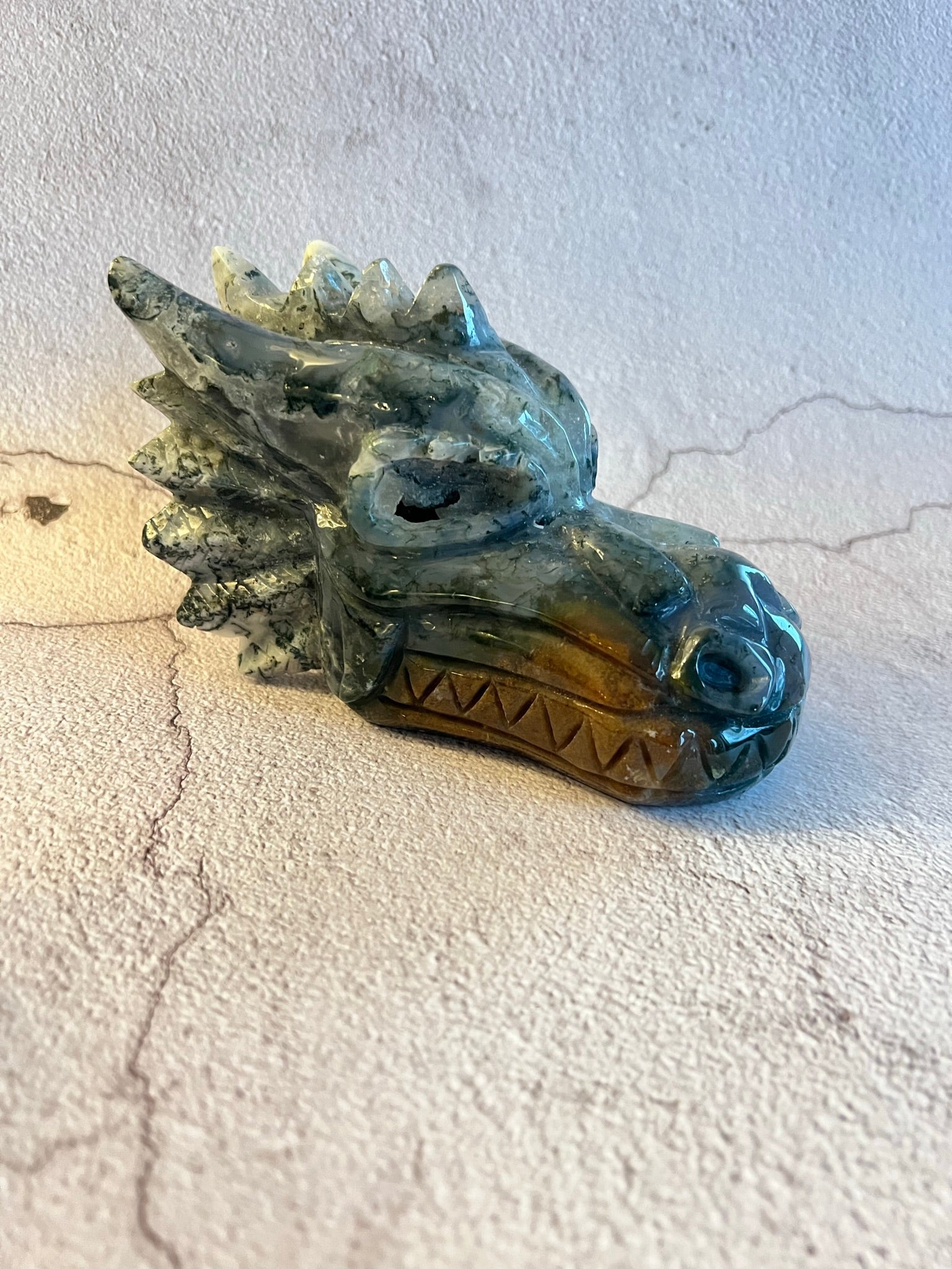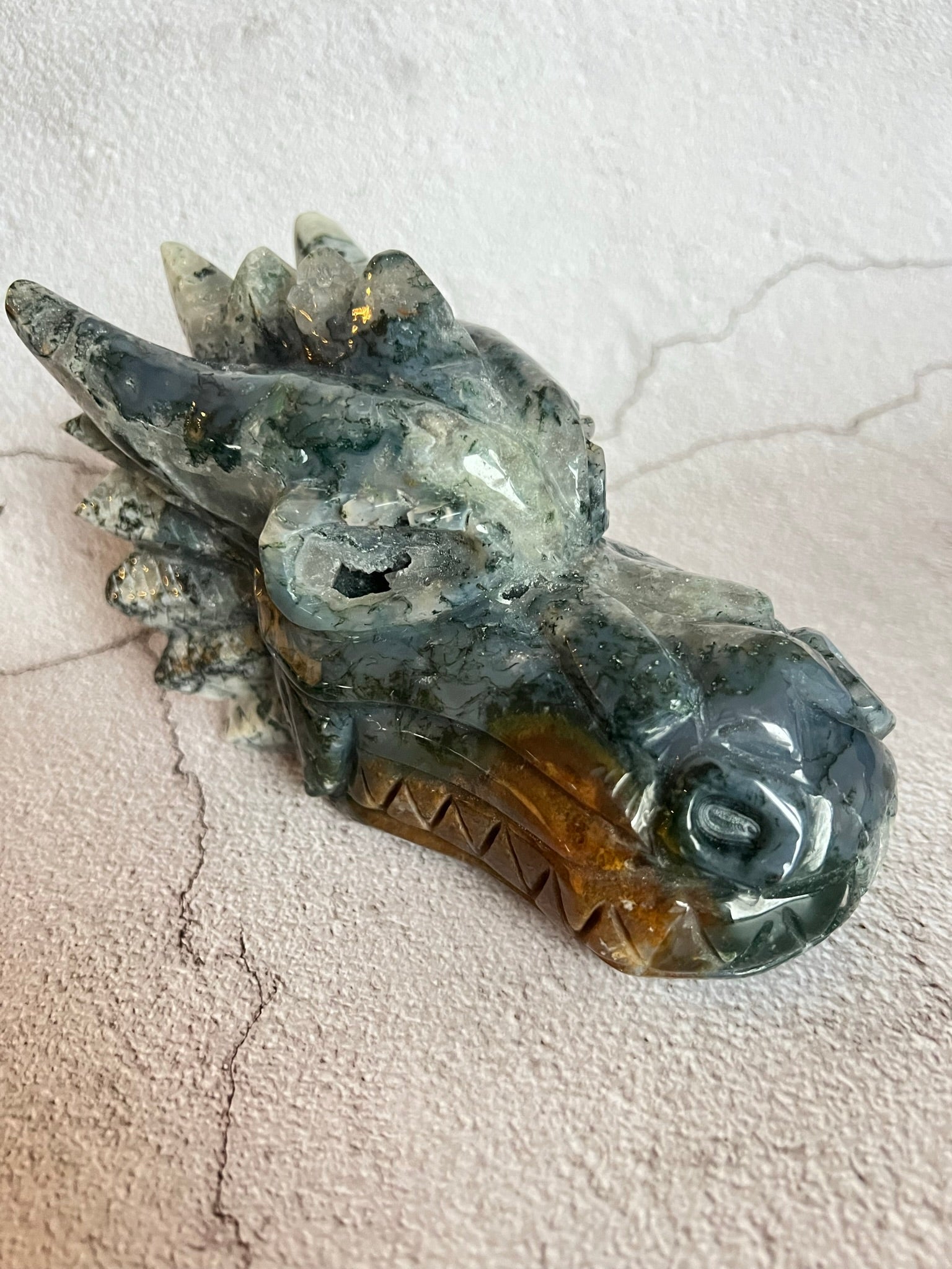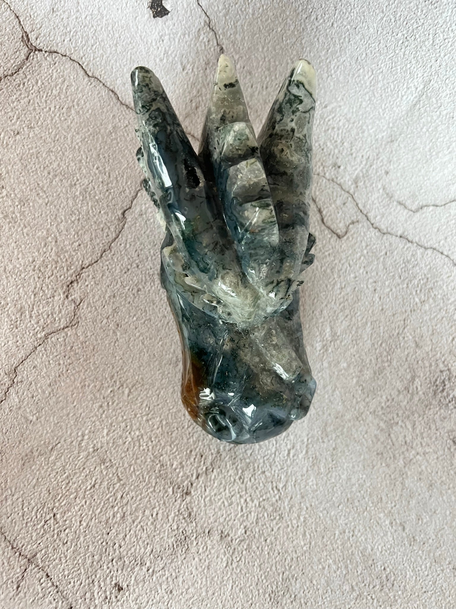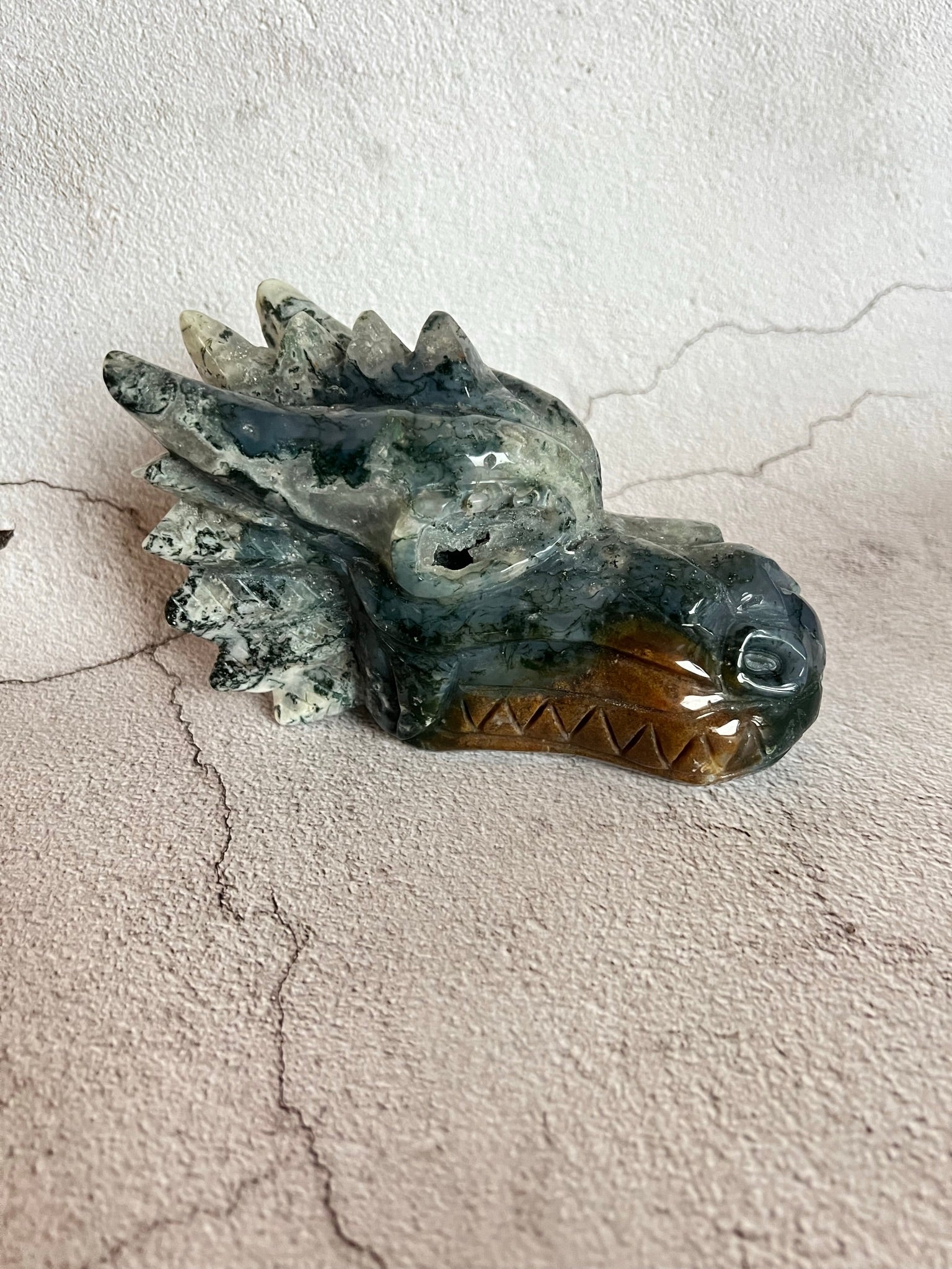 Deze prachtige blauwe mosagaat draak, met zijn majestueuze vorm en diepblauwe tinten, brengt niet alleen een vleugje elegantie in je leefruimte, maar ook helende energieën voor je lichaam en geest. Met een gewicht van 1,5 kg, voel je de aanwezigheid van deze draak in elke vezel van je wezen.