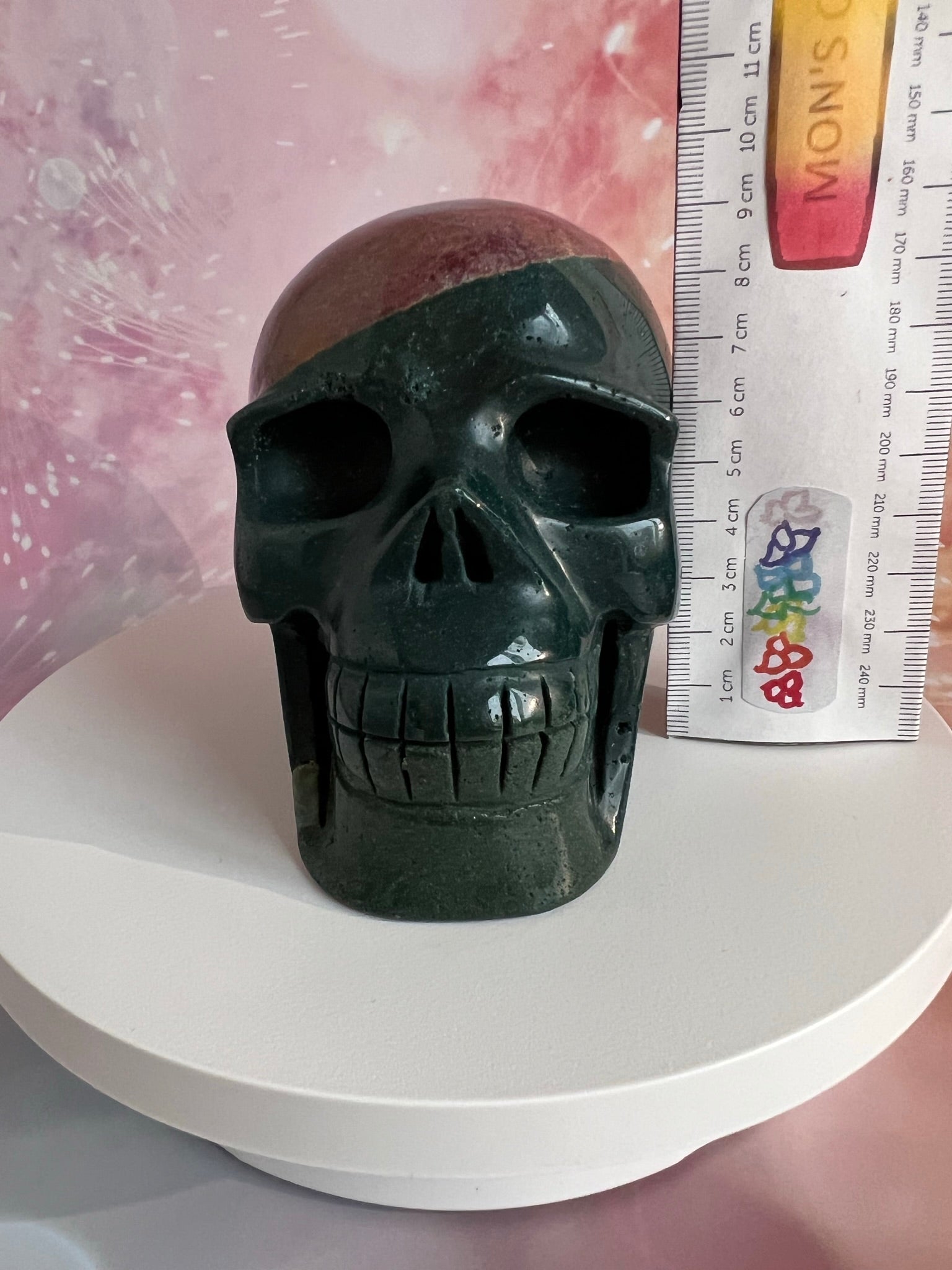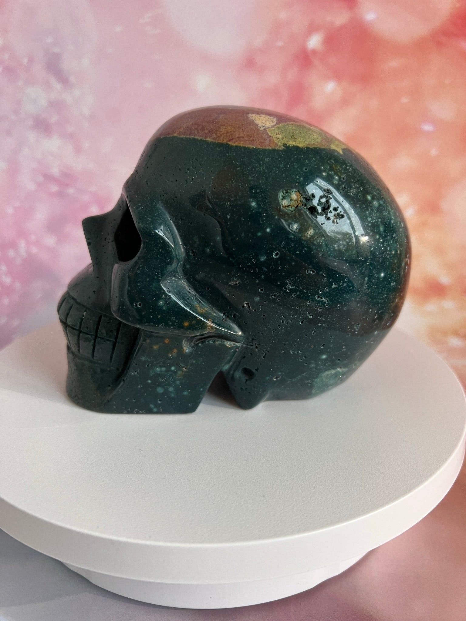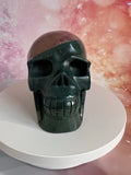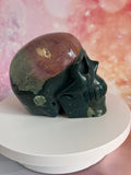 Met zijn aardse energie brengt de Oceaan Jaspis Skull rust, innerlijke vrede en bevordert hij emotionele healing. Om met deze skull te connecten, houd je hem vast en stel je je open voor zijn kalmerende energie.