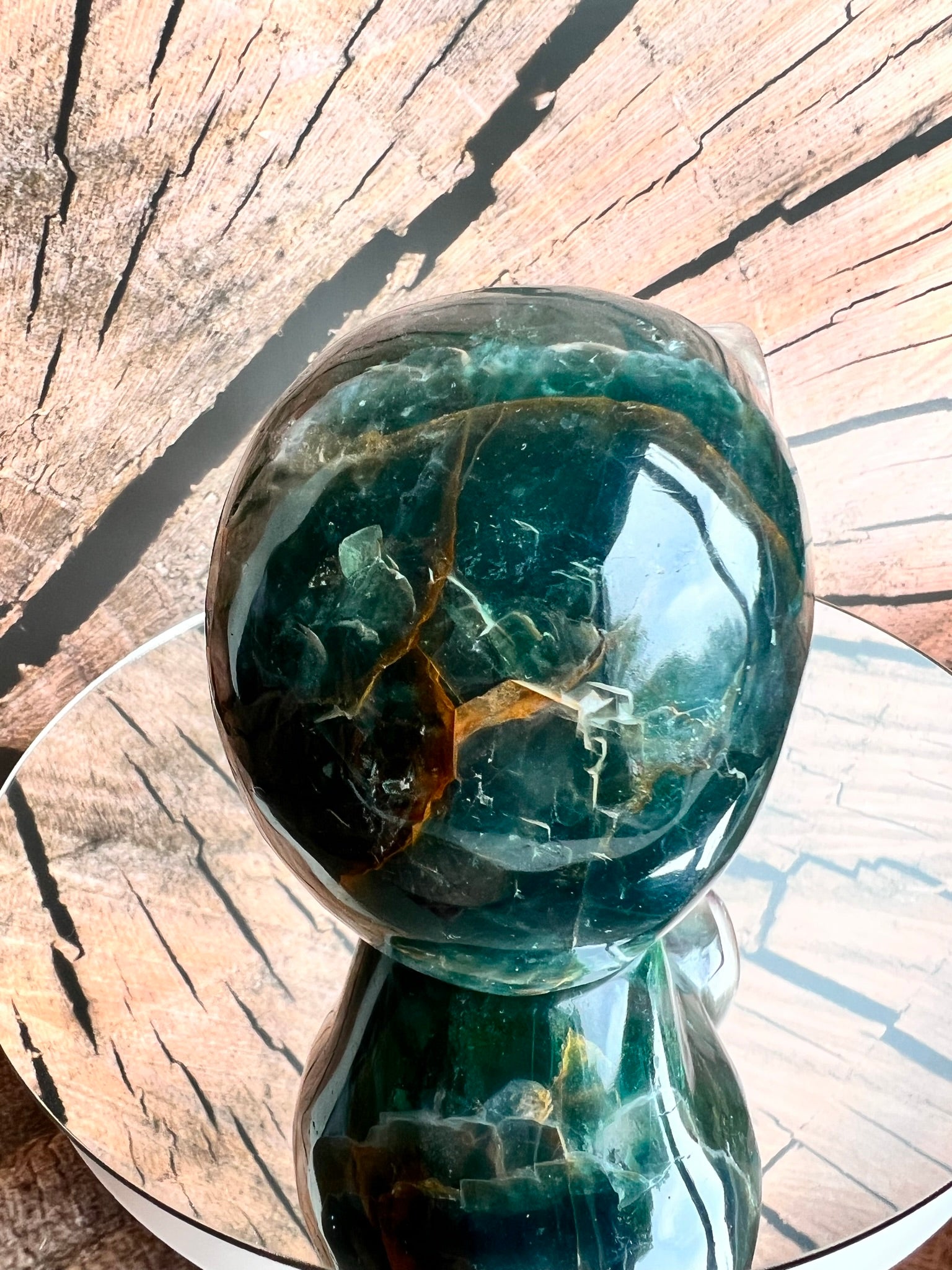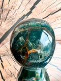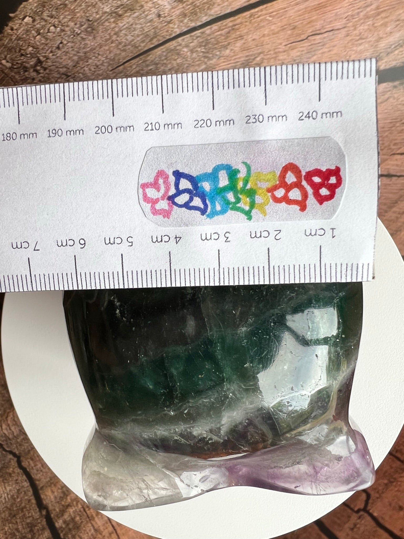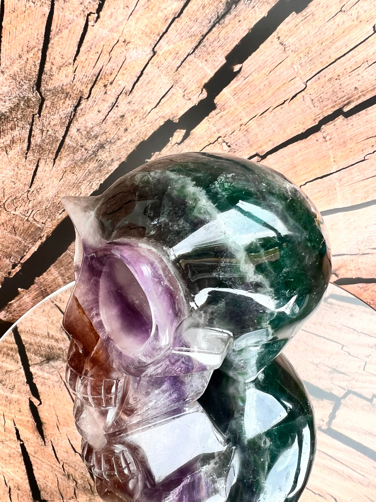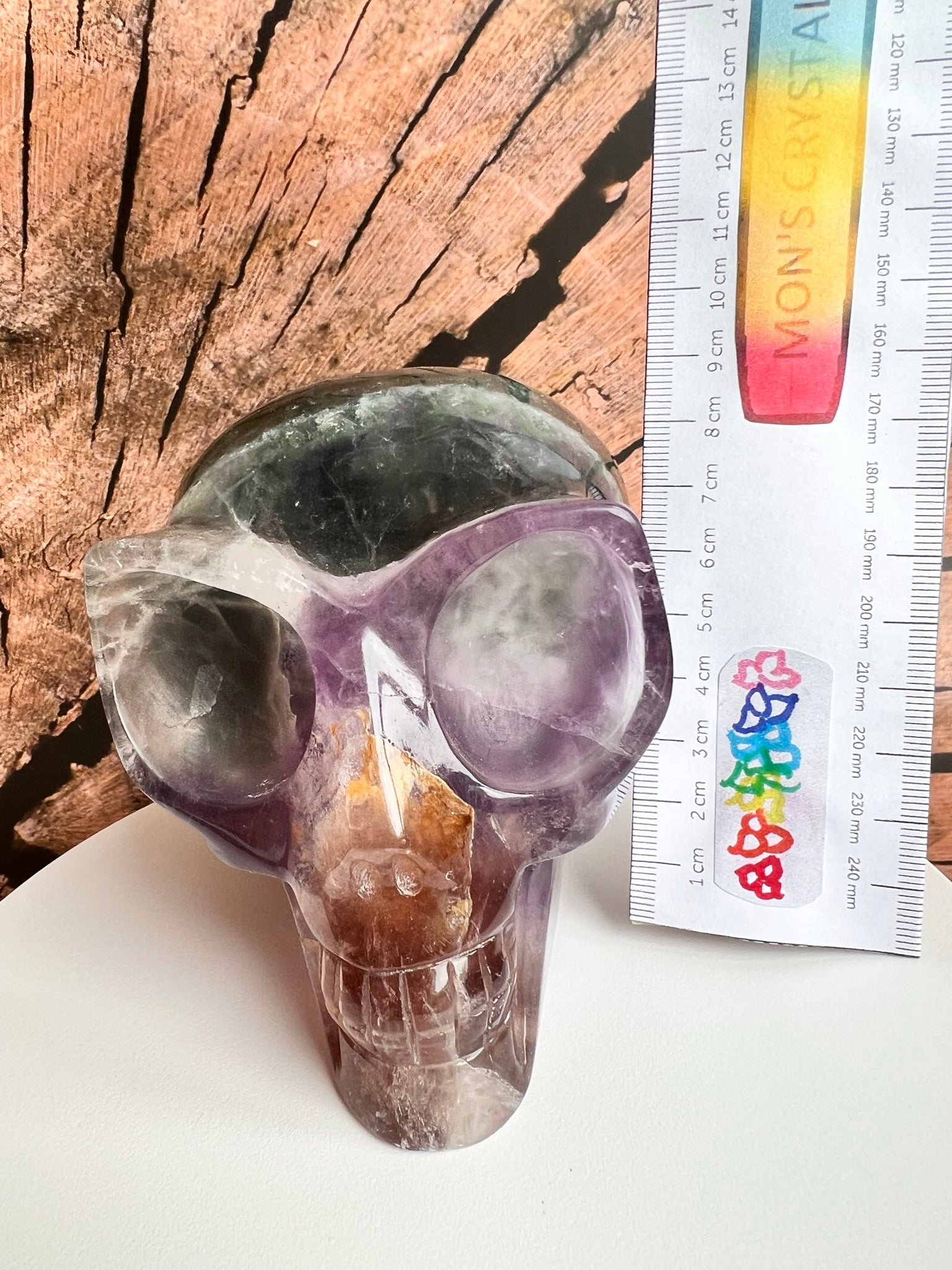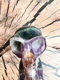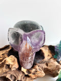 Deze veelkleurige schedel van Regenboog Fluoriet werkt harmoniserend op alle chakra's en stimuleert helderheid en intuïtie. Om met deze skull te connecten, houd je hem in je handen, sluit je je ogen en laat je zijn energie je chakra's doordringen.