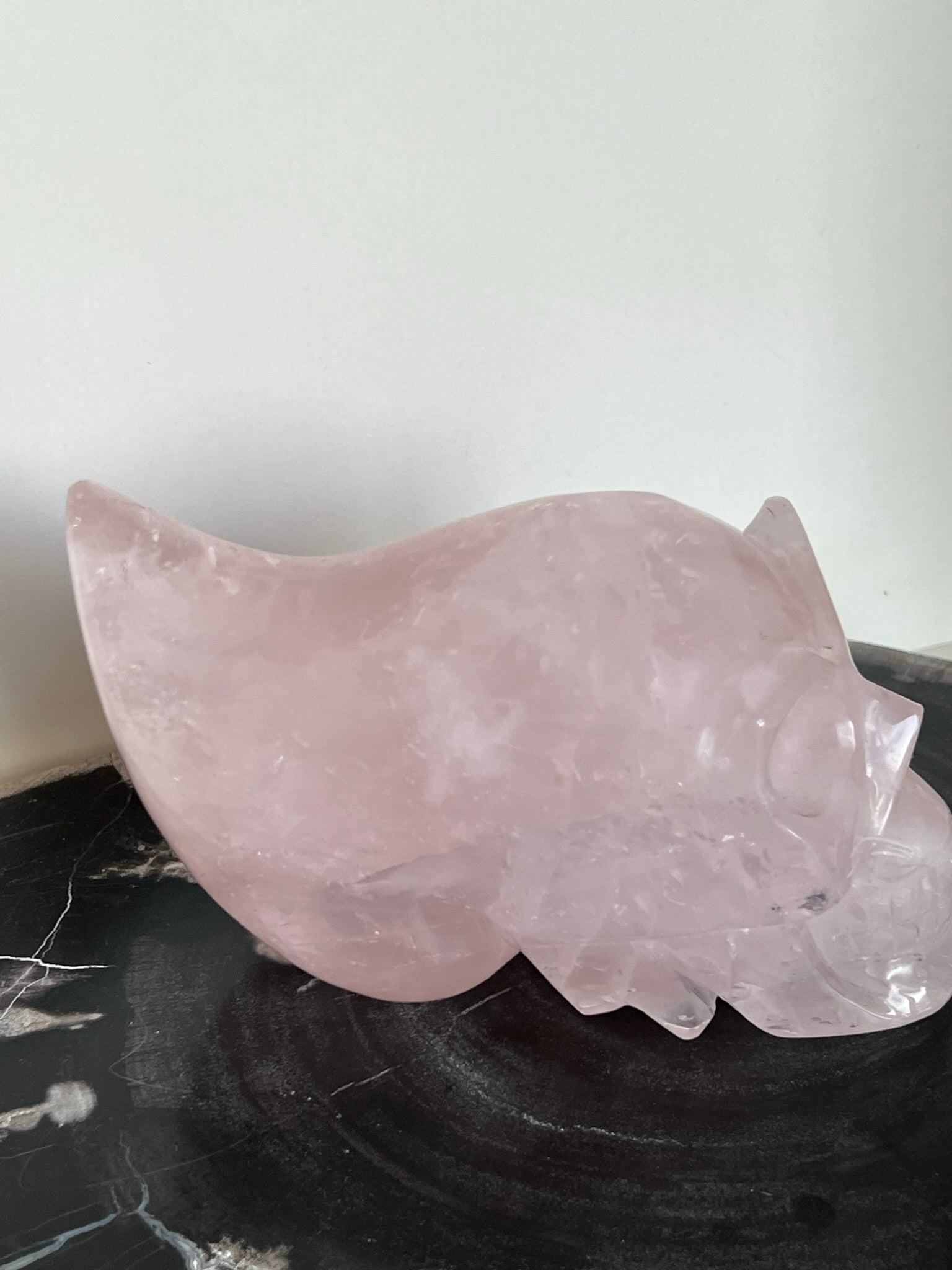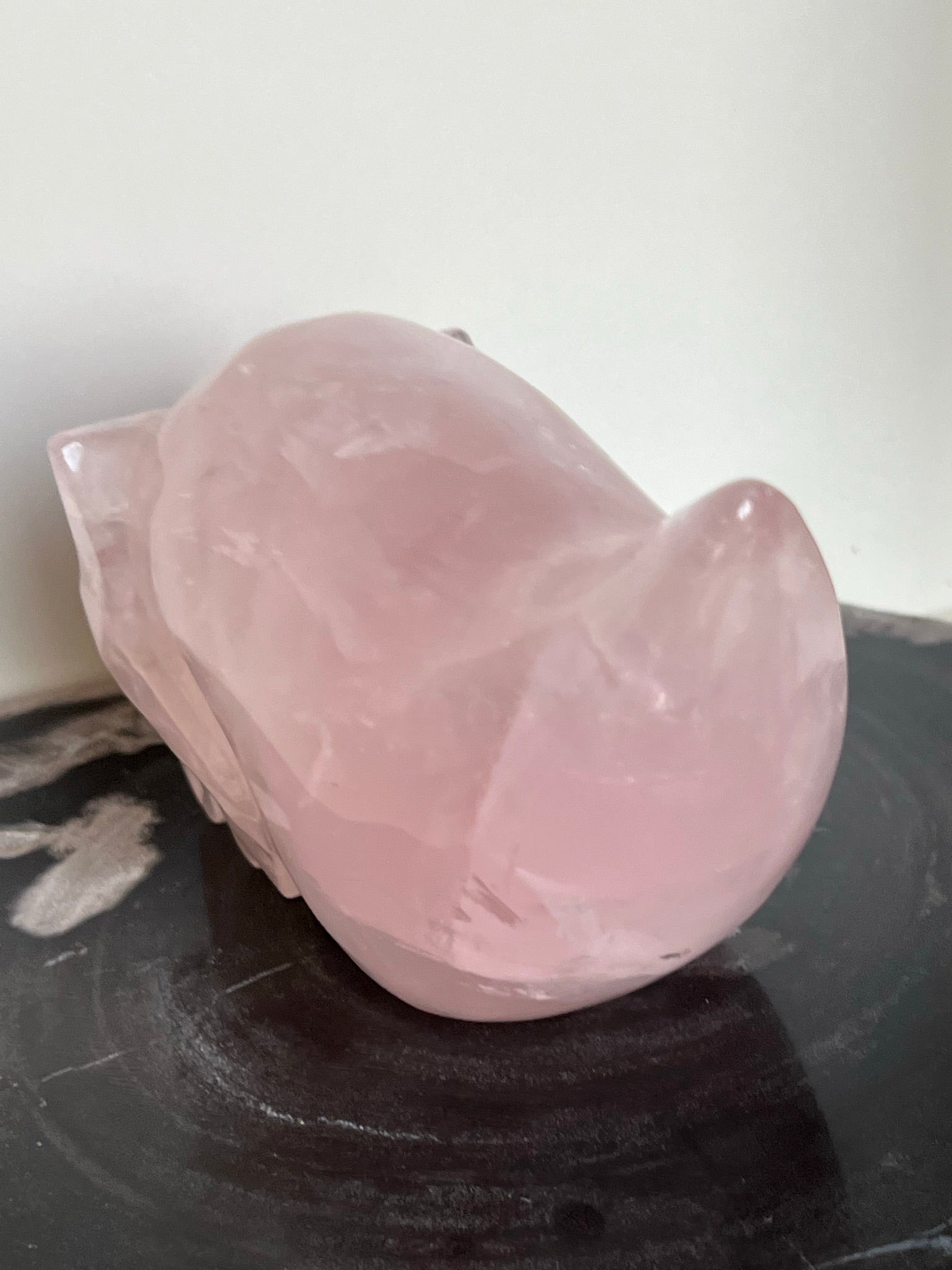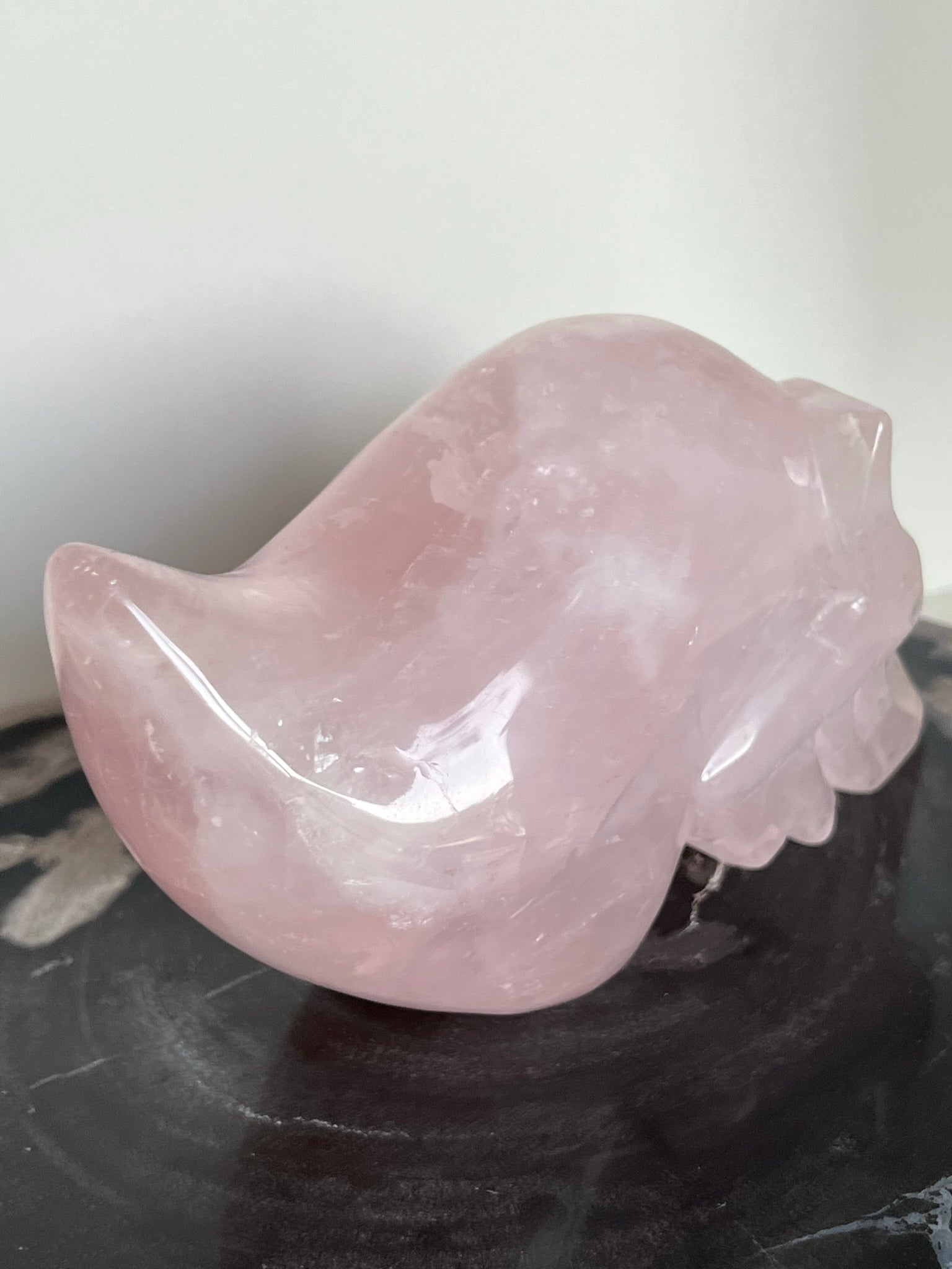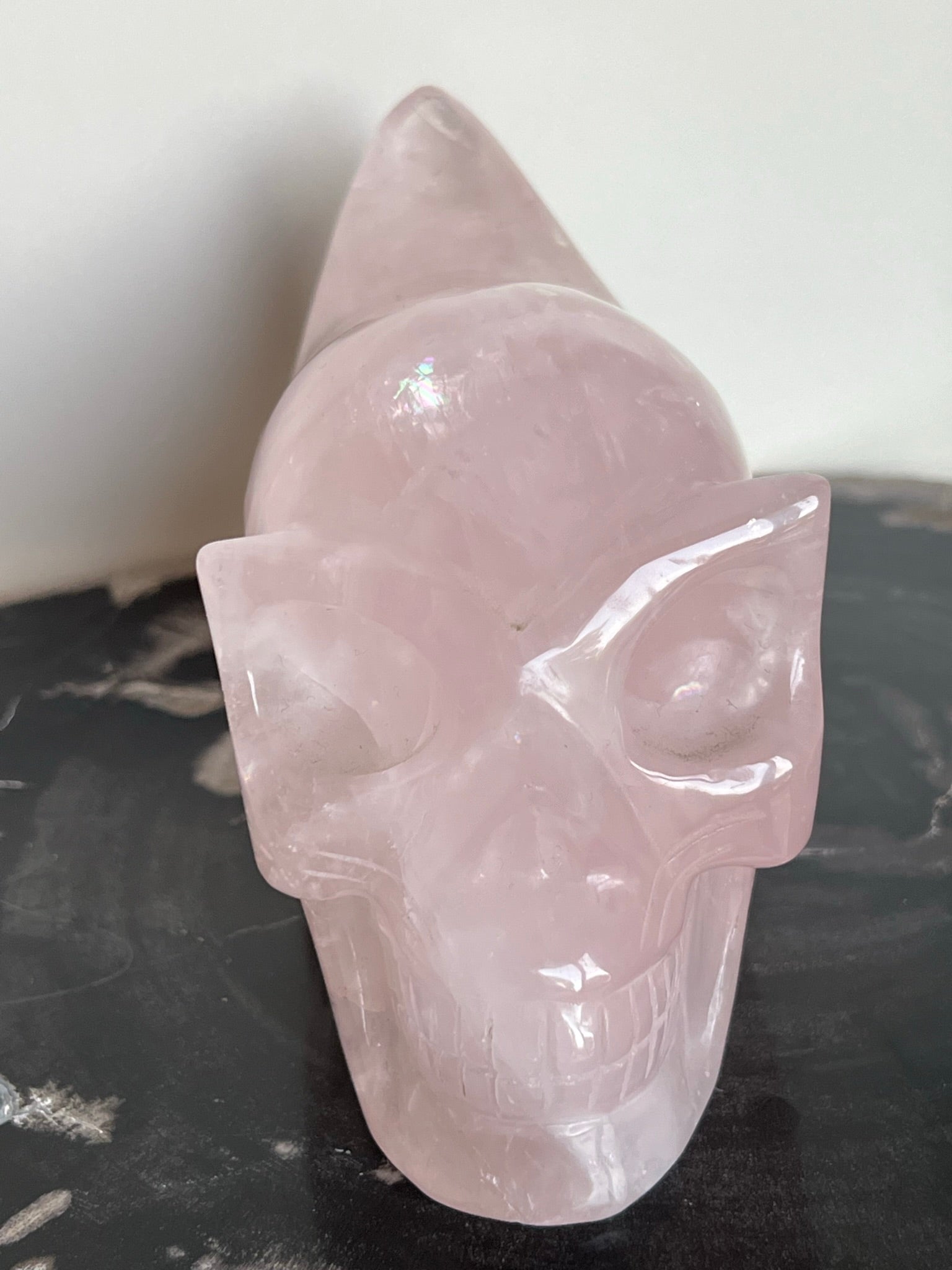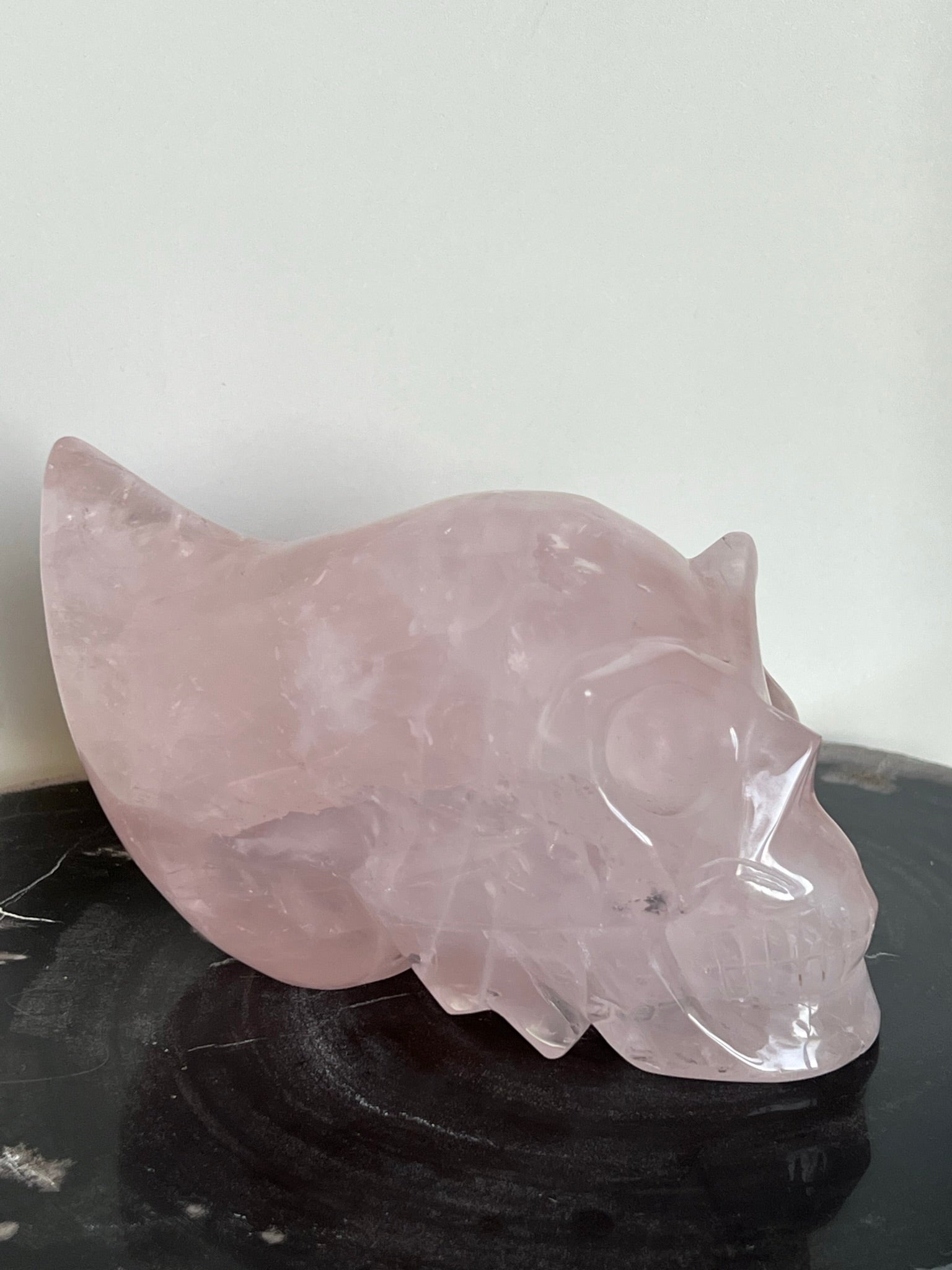 Rozenkwarts Skull: Deze zachte en liefdevolle Rozenkwarts Skull werkt op het hartchakra en bevordert harmonie en zelfacceptatie. Om met deze skull te connecten, houd je hem tegen je hart en voel je zijn liefdevolle energie je hartchakra openen.