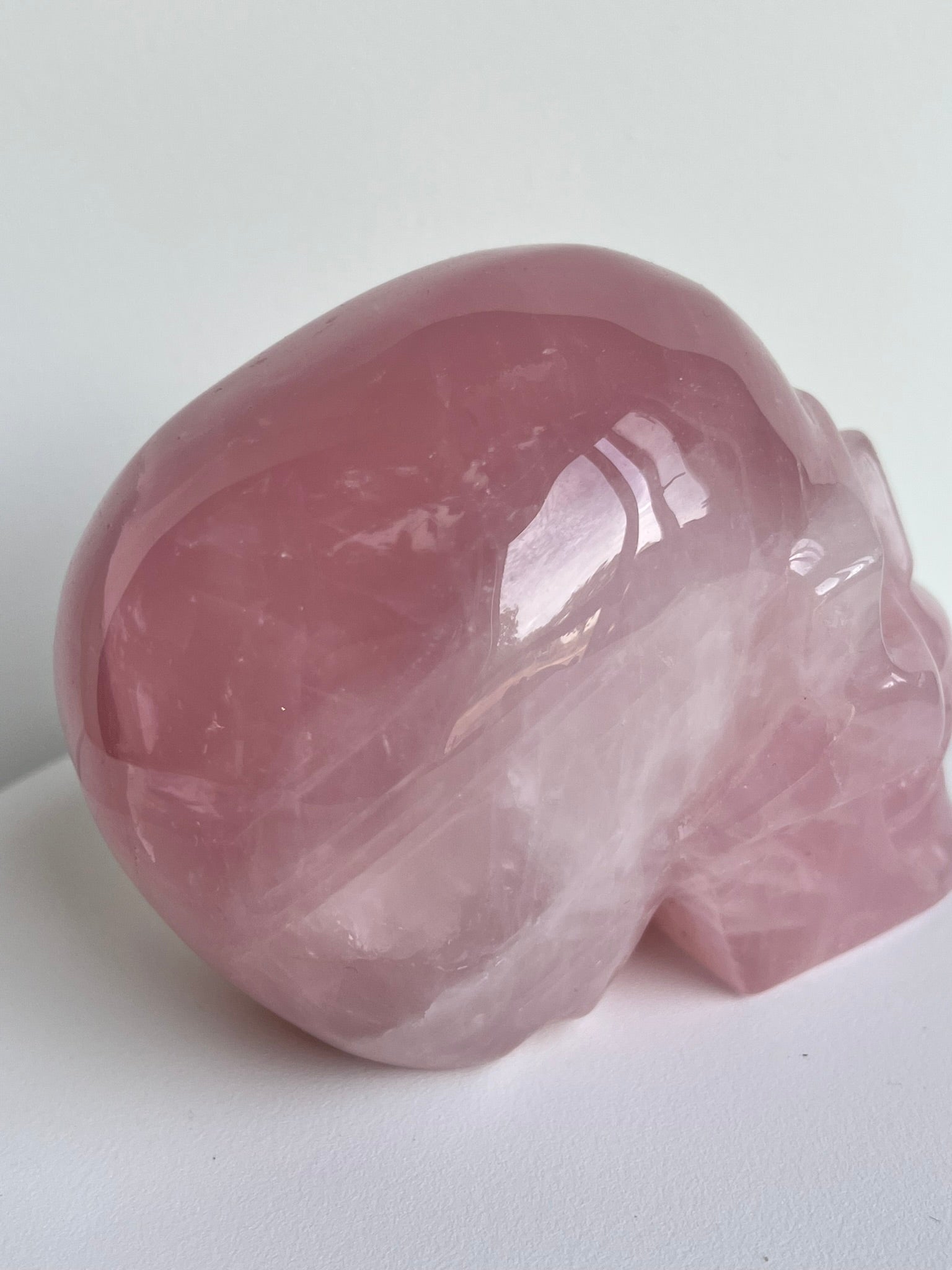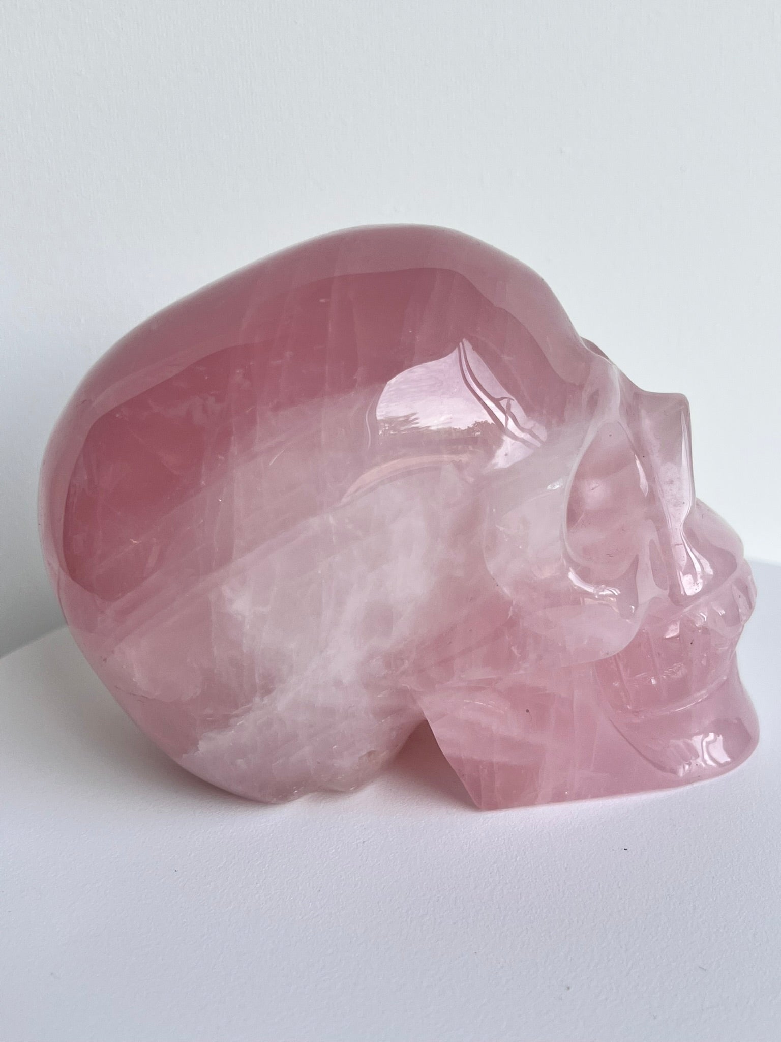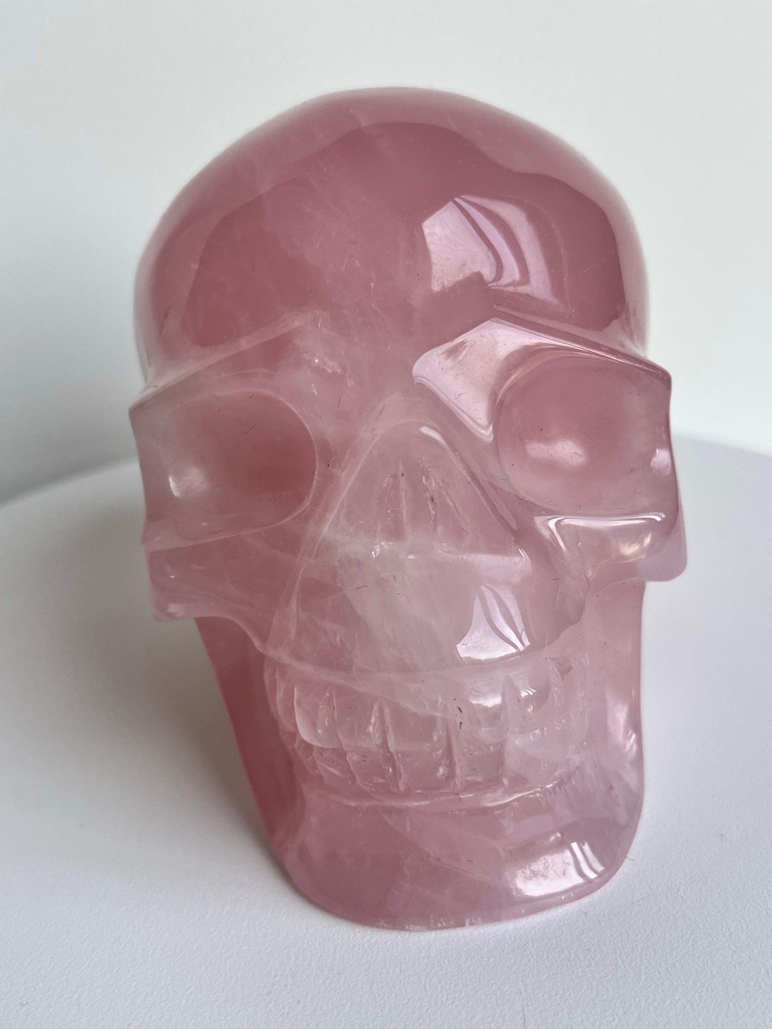 Rozenkwarts Skull: Deze zachte en liefdevolle Rozenkwarts Skull werkt op het hartchakra en bevordert harmonie en zelfacceptatie. Om met deze skull te connecten, houd je hem tegen je hart en voel je zijn liefdevolle energie je hartchakra openen.