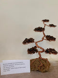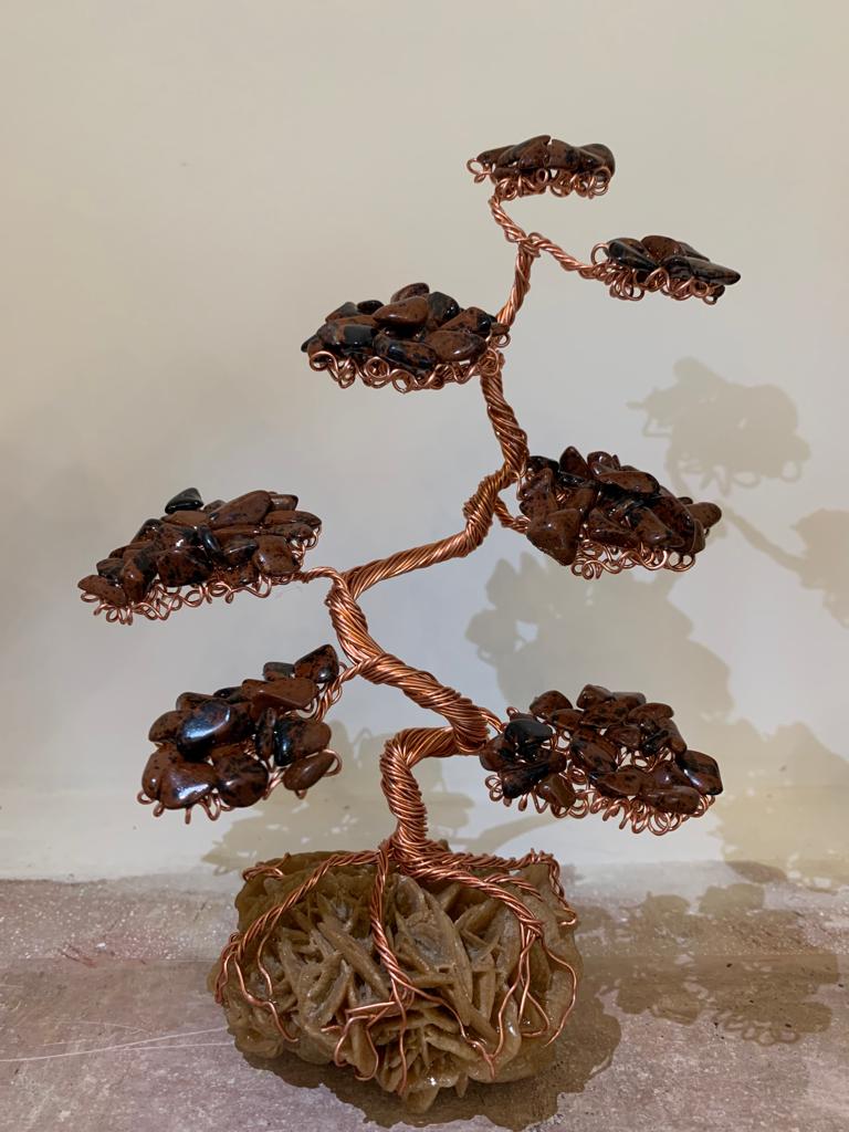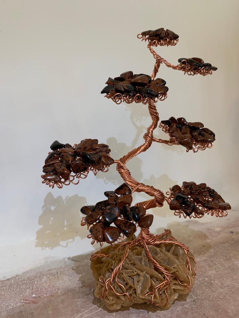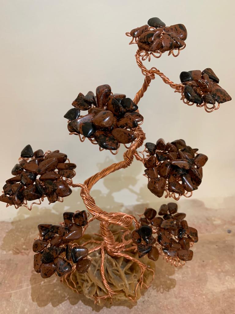 * Spiritueel: Deze unieke handgemaakte bonsai boom combineert de beschermende energie van mahonie obsidiaan met de aardende en stabiliserende energie van de woestijnroos. Samen kunnen ze je helpen bij het loslaten van negatieve patronen en emoties, en een gevoel van gronding bevorderen.