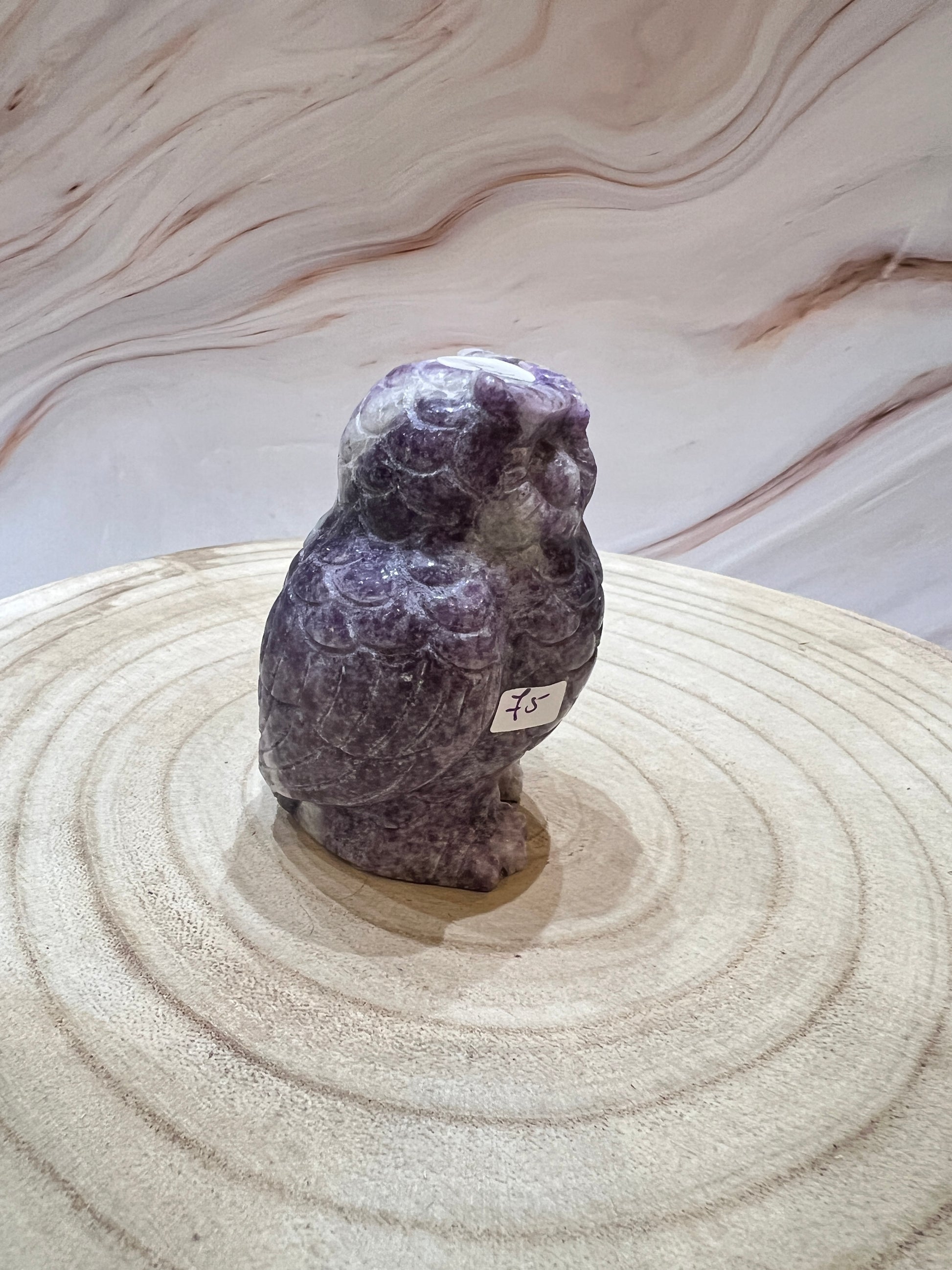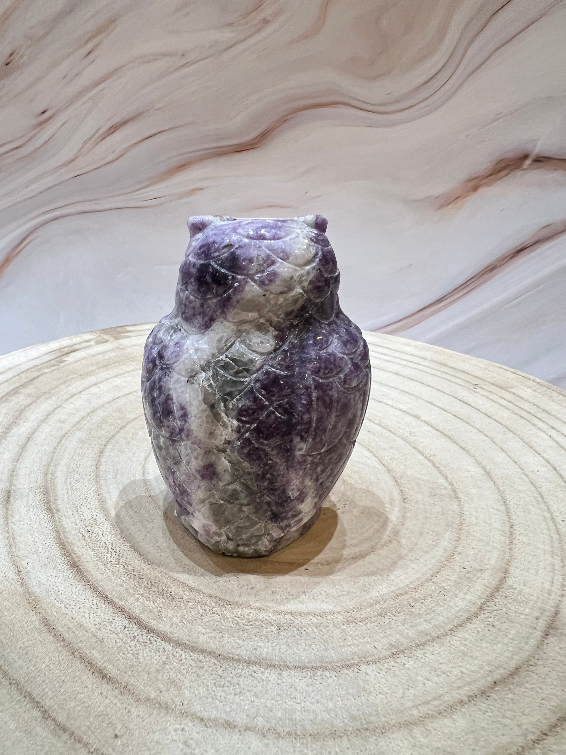 ✨ Eigenschappen: Kalmerende uil van lepidoliet, de steen van emotionele balans en spirituele groei.